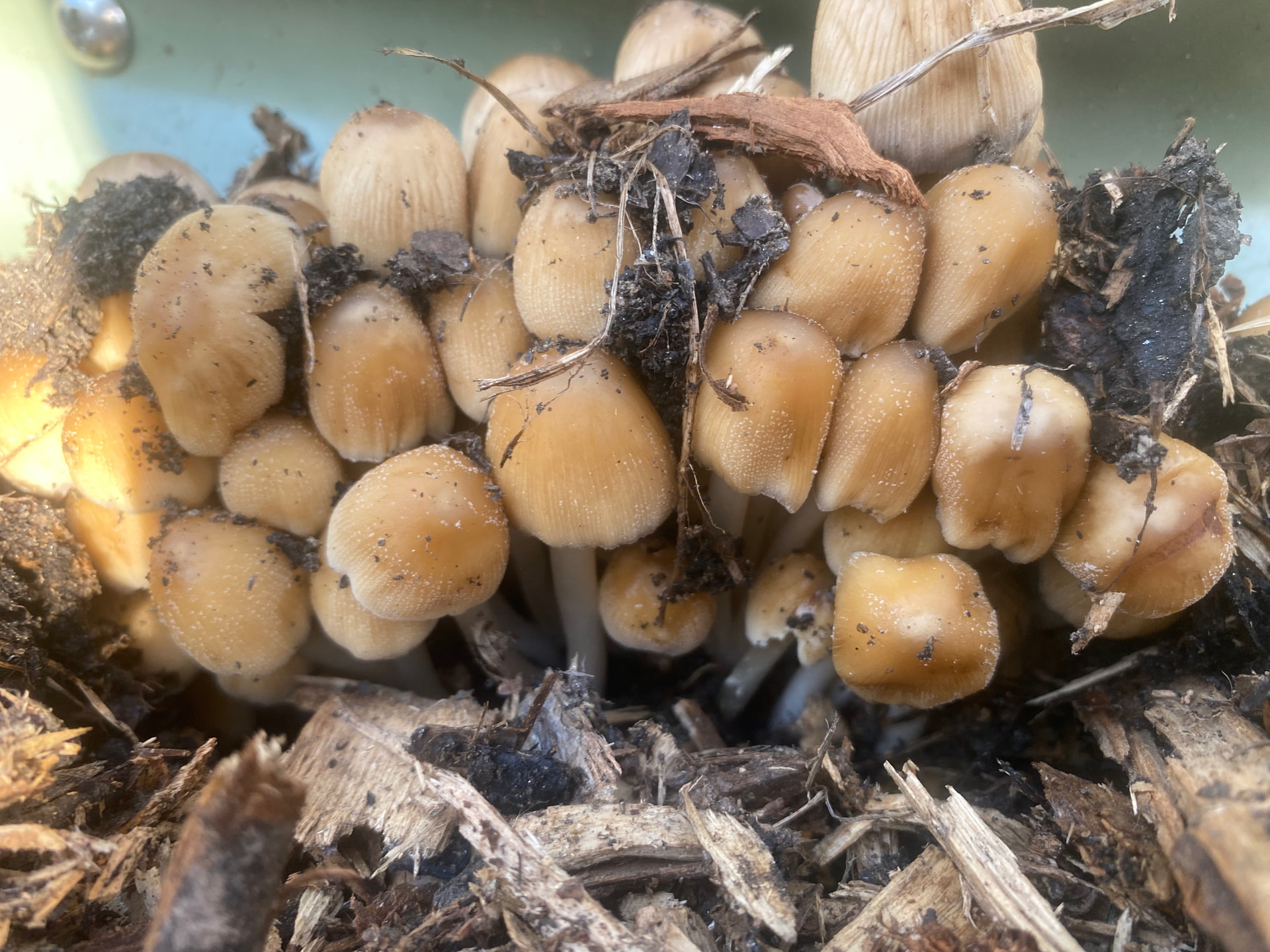 As already mentioned, these mushrooms are not poisonous and are beneficial to the garden. They are edible but, in my opinion, not very tasty. I donât bother harvesting them. If you donât like their appearance, removing them as soon as they appear will not hurt their useful mycelium; but they will keep coming up as long as there is sufficient moisture and fresh wood chips to colonize. There is no real need to do anything about them; their inky residue will disappear soon enough.