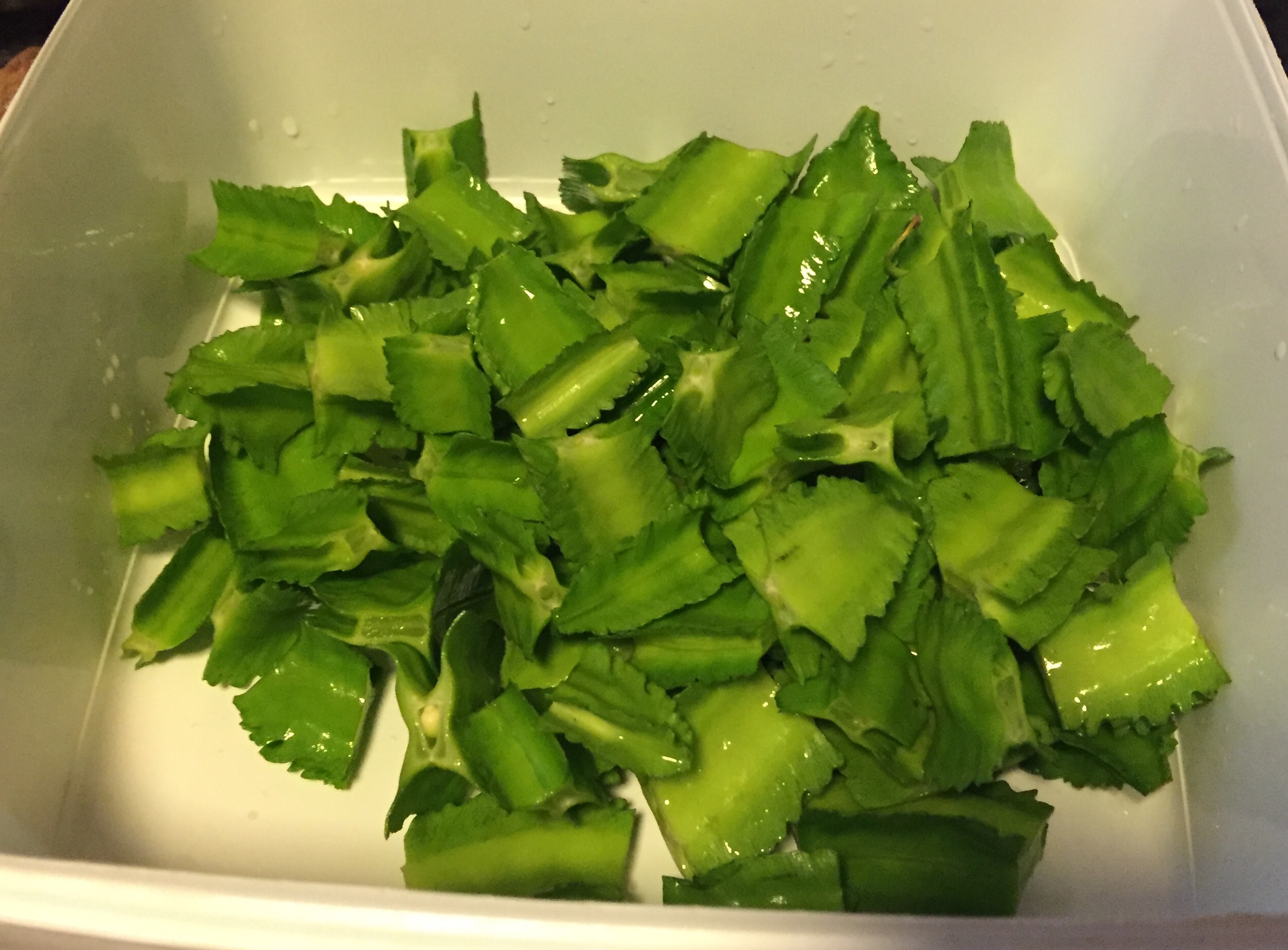 My mother boiled up the Winged Bean root in a batch of potatoes & salted cod. The skin and the fibrous underlayer had to be peeled off before cooking. It was much firmer than potato (but not crunchy nor watery), you could be forgiven for thinking it requires a very long cooking time… It doesn’t. Despite the firmness, it was fully cooked, easy enough to eat, and enjoyable.
