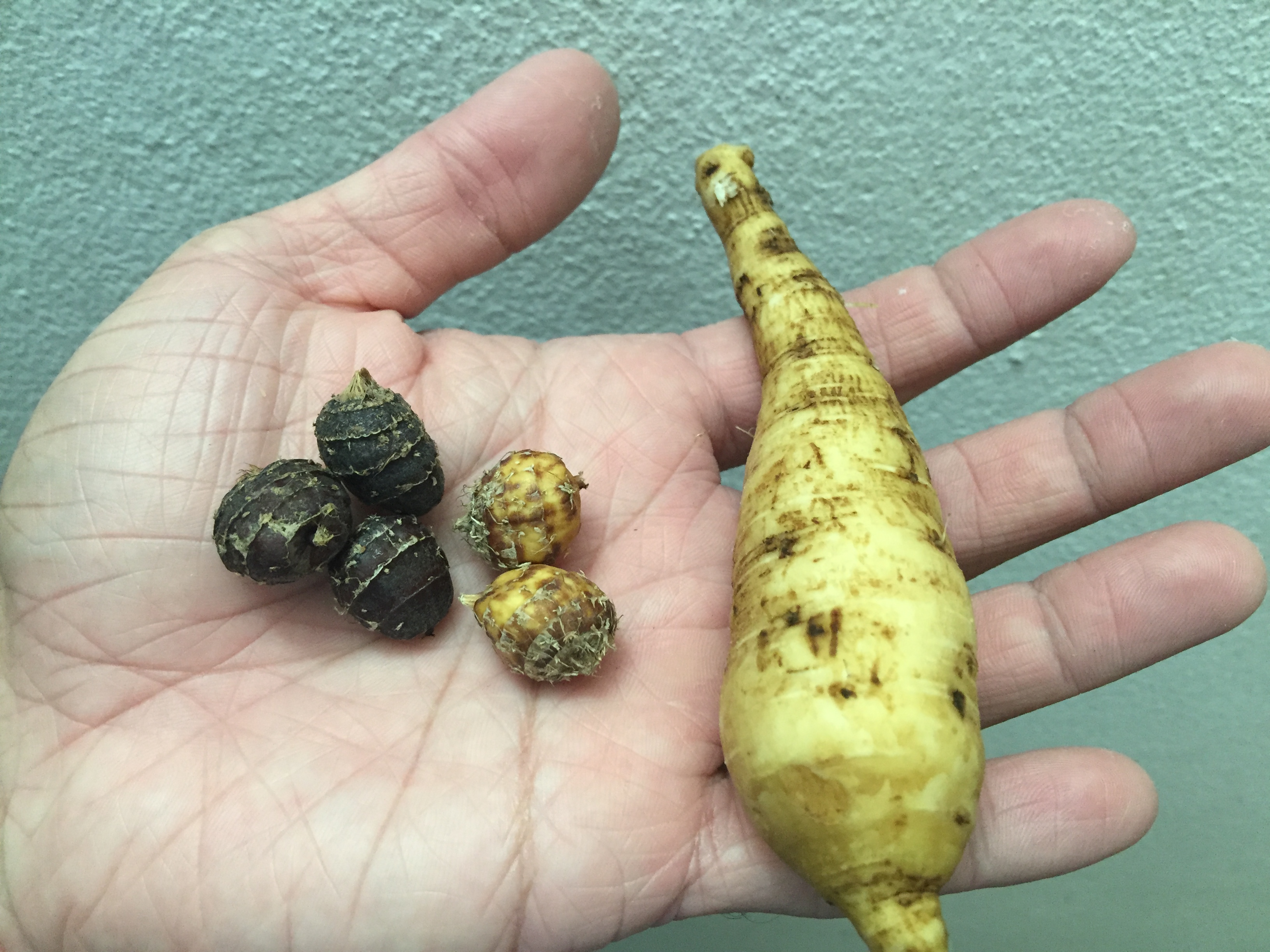 I harvested 3 Chufa plants, but left the rest behind in their container. The “nuts” were huge! Much bigger than last time I grew them. The last variety (since lost) was an unnamed chufa, these guys are named selections I bought for their larger tuber size. They’re still small, but comparatively bigger. I didn’t go for a full harvest because there were very few nuts per plant, as few as two (I don’t think that had anything to do with the size). I grew them tightly packed in a container of depleted potting soil, no fertilizer, and I may have picked them early (I did see a tiny white nut forming). Perhaps it’s too late for this batch of plants, but I expect a bigger harvest next time I grow them (fertilized, of course). Varieties “Large Black” and “Reisen Aus Ghana”. I’d like to try out other varieties as well, but for now I’ll stick with these two.