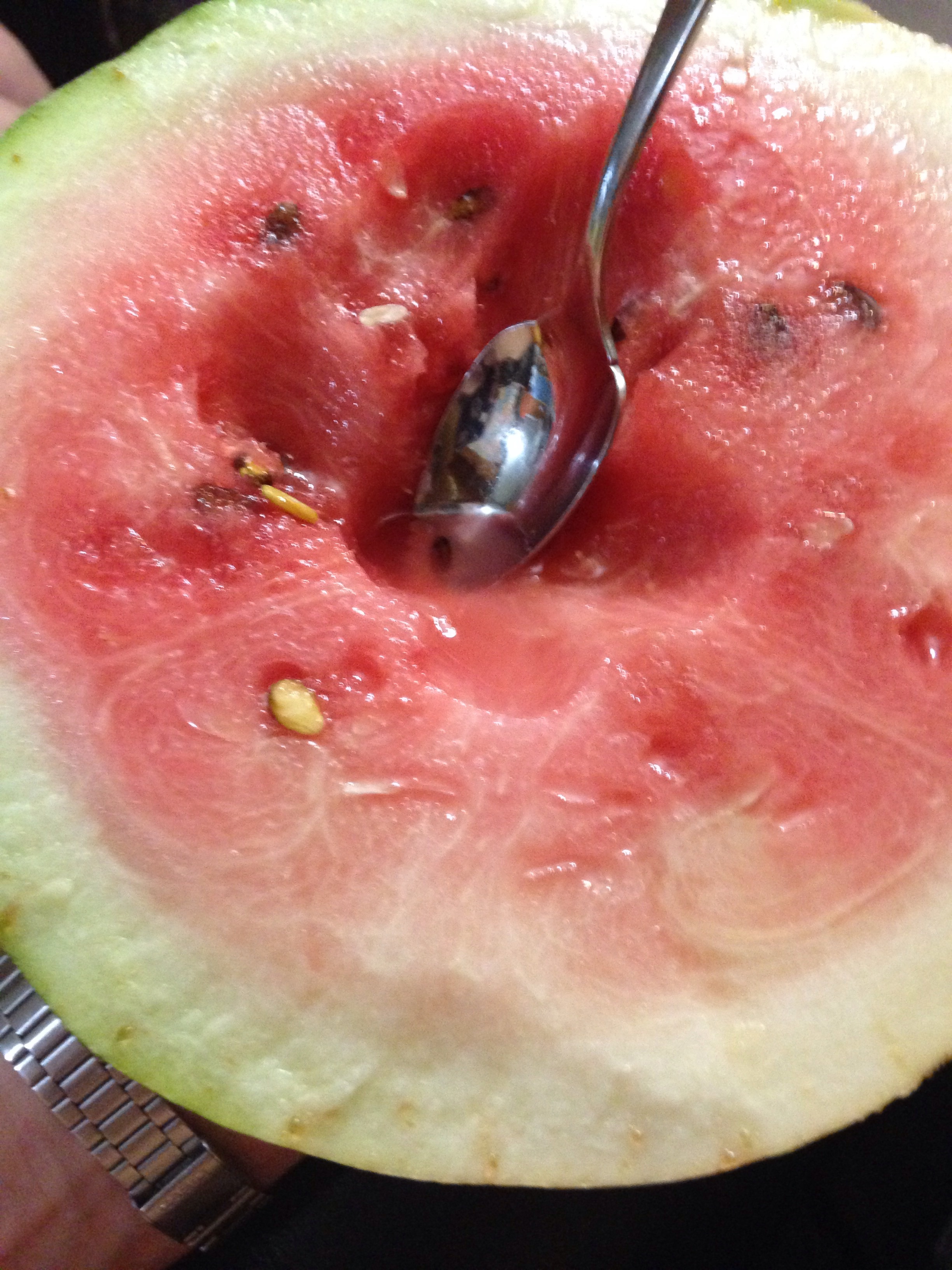 Warm watermelon fresh from the garden, yum. This one Is a bit under ripe, but I prefer them to over ripe. My twelve year old nephew was over a week ago, I thought it would be neat for him to pick his own watermelon and get to eat it fresh. So many kids don’t get that connection between planting, growing , harvesting food these days. He picked a perfectly ripe sugar baby. I put it in the freezer and let it chill. I let him cut it in half with his grandpa’s butcher knife. He wouldn’t eat it because it had seeds, what is the world coming to?