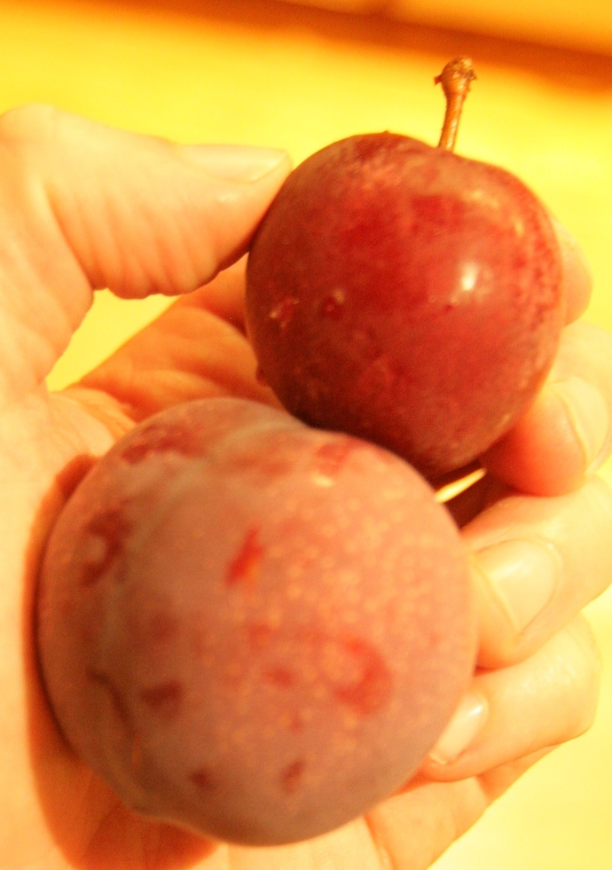 The one on top is a Satsuma plum. Nice flavor and 15-16 brix, with dark red flesh. Much less juicy than Laroda or Superior (a good thing, as I prefer my fruit non-drippy).