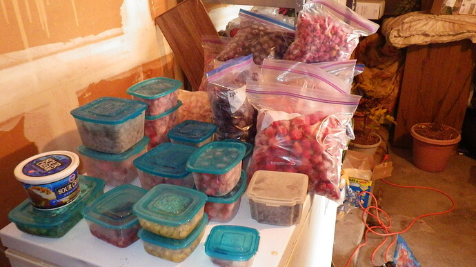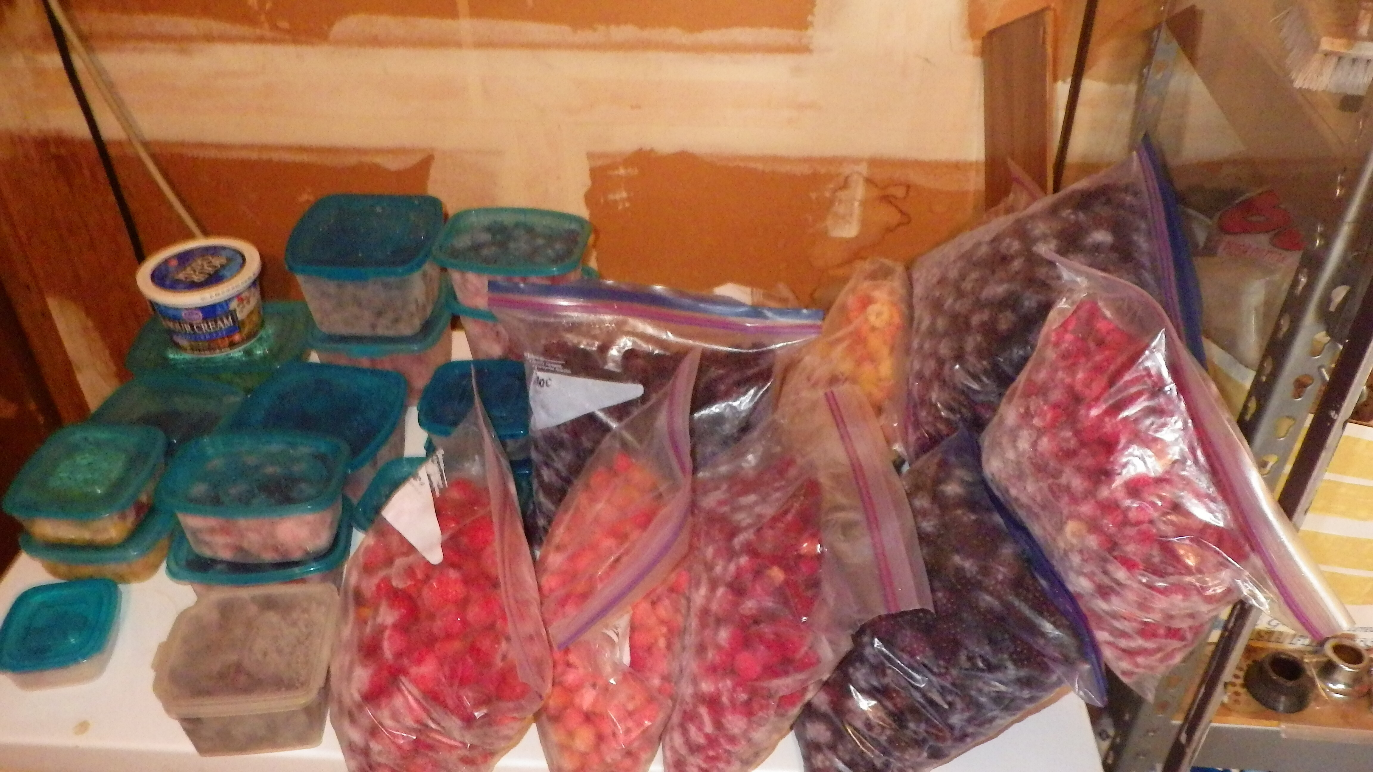 Here’s my stash from my berry harvest. I also made about 30 jars of jam and ate fresh berries daily, and still had this much to freeze. I was digging out a turkey buried on the bottom of my freezer, so thought I would take some photos.
