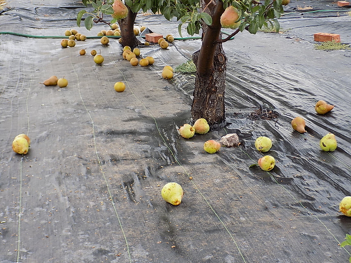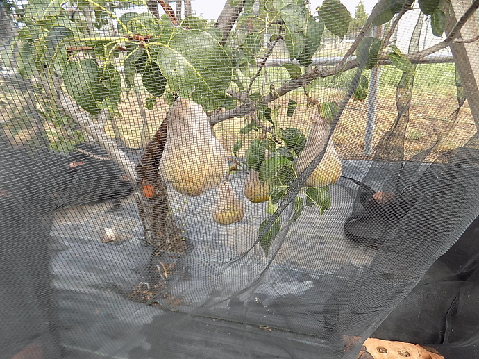 Had some wind today so lost about 4 gallons of pears. On picking those up I saw that the birds were already eating them. So put on some bags and when those ran out put on the 30% shade netting.