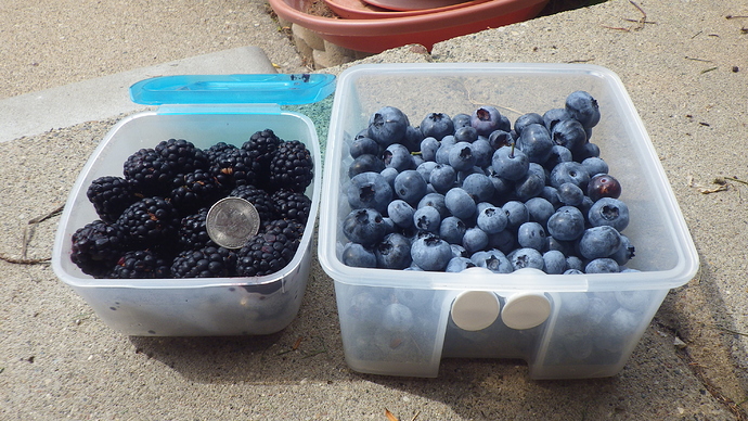 A good blueberry and blackberry harvest today. I got a gallon of blackberries, the best grade ones were put in this container for fresh eating. Navaho, Loch Ness, and Triple Crown cultivars were picked today. Chester is still red. One ripe berry, and it was fantastic. A cultivar often described as having good berries, not excellent. Well they are excellent this year. Balls of sugar.
