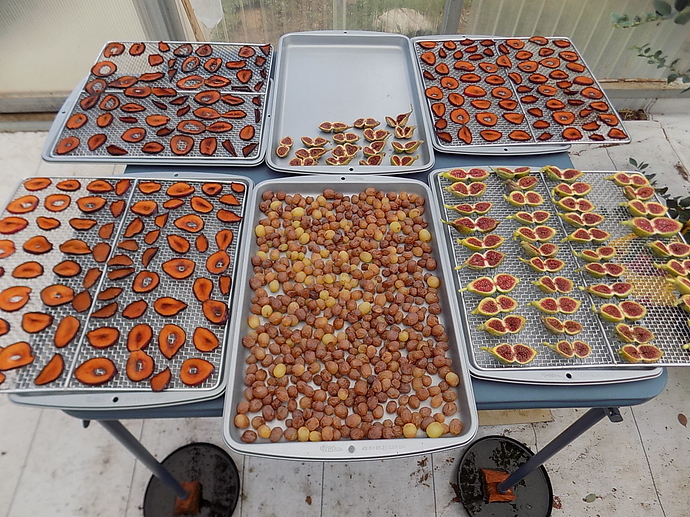 Been drying fruit non stop for two months. This is today’s setup. Notice the water moats to keep ants at bay.