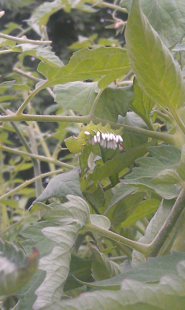 I’ve been hit by hornworms HARD every year, but I avoided spraying specifically because I was hoping this parasitic wasp would show up.