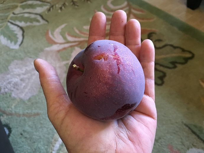 And, this Flavor Finale fell off in my hand this afternoon. They’re not supposed to be ripe for another month (mid-Sept to early Oct), but my wonderful hubby, who dug out 24’ of Shell Ginger and was looking for a pick me up snack, said he checked and one fell off in his hand this morning. So, going to go down this evening and pick anything that is ready to go. This is the largest pluot I have. They get absolutely huge, and this tree set really well. Probably could have even thinned a bit, but was so ecstatic that it set for the fist time, I left the all. It is about 50% larger than Flavor King and my other pluots, and a close 2nd in flavor: Plus, it is very, very late, which is wonderful to extend stone fruit season out so late. Or, potentially so!