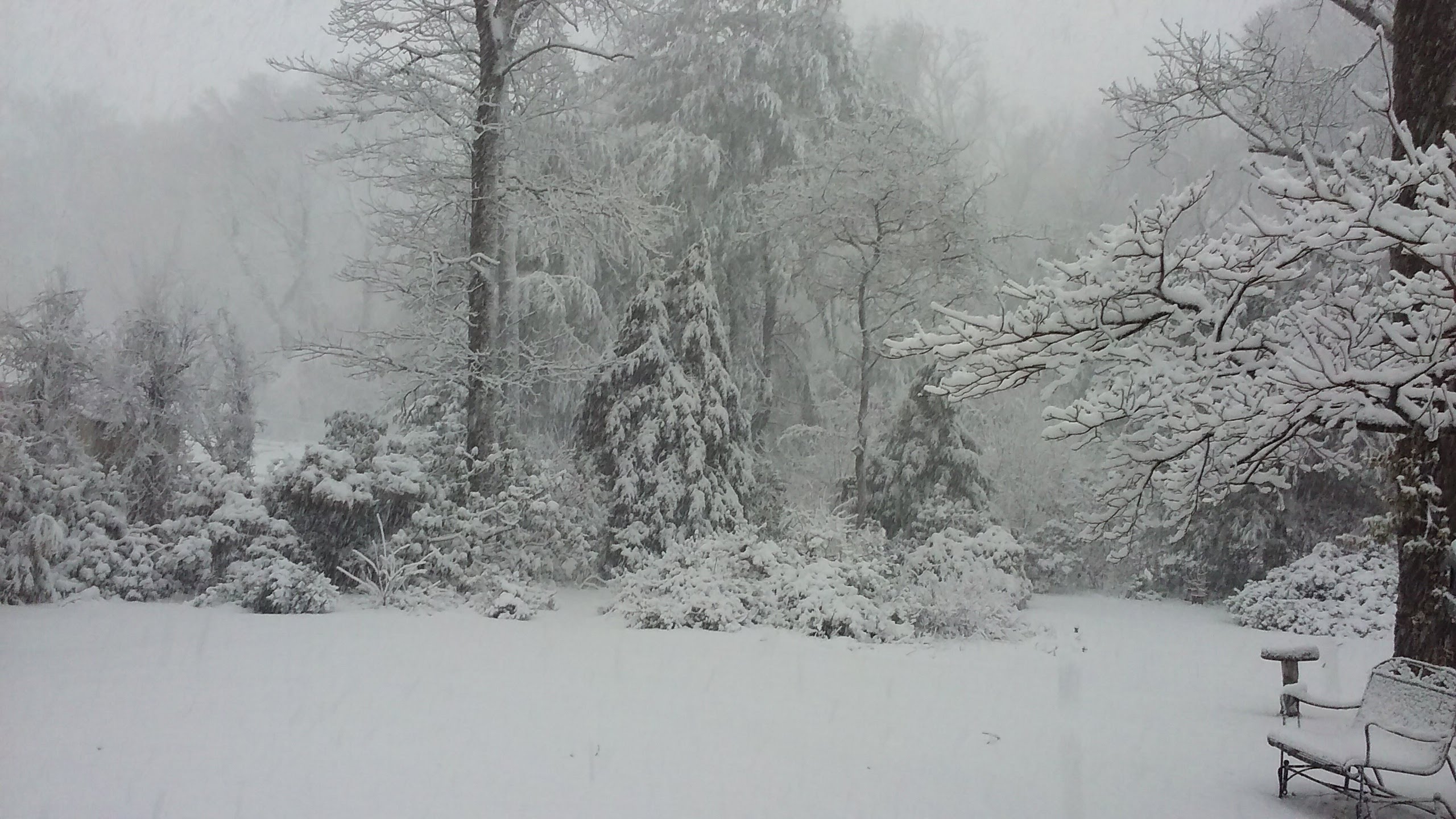Snow’s been coming down off and on all morning. The deck is covered with a thin layer, but it’s not sticking to the ground very well. It is sticking to some brush and weeds, which makes a curious contrast with the now deep green grass. It’s 34 and warming a bit, so it won’t stick around. I’m sure glad I got those blackberries planted yesterday, it’s about 25° colder today.