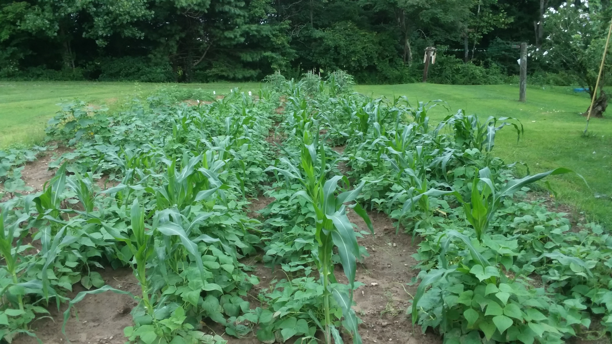 5 rows of corn, with beans. Three varieties of corn and beans each. Corn is Honey Select, Ambrosia and Kandy Korn. Beans are white and striped half-runners and Rattlesnake pole beans.