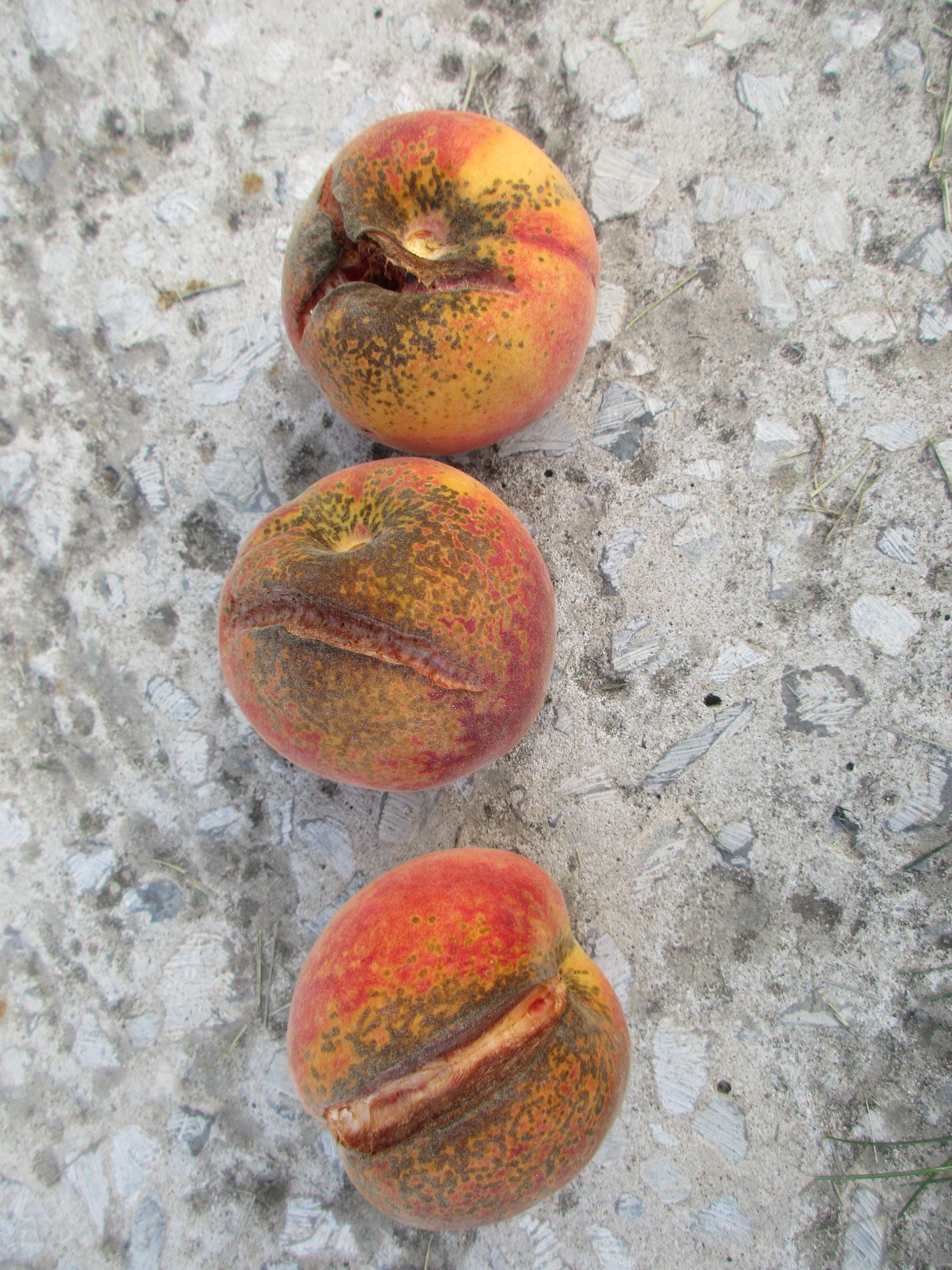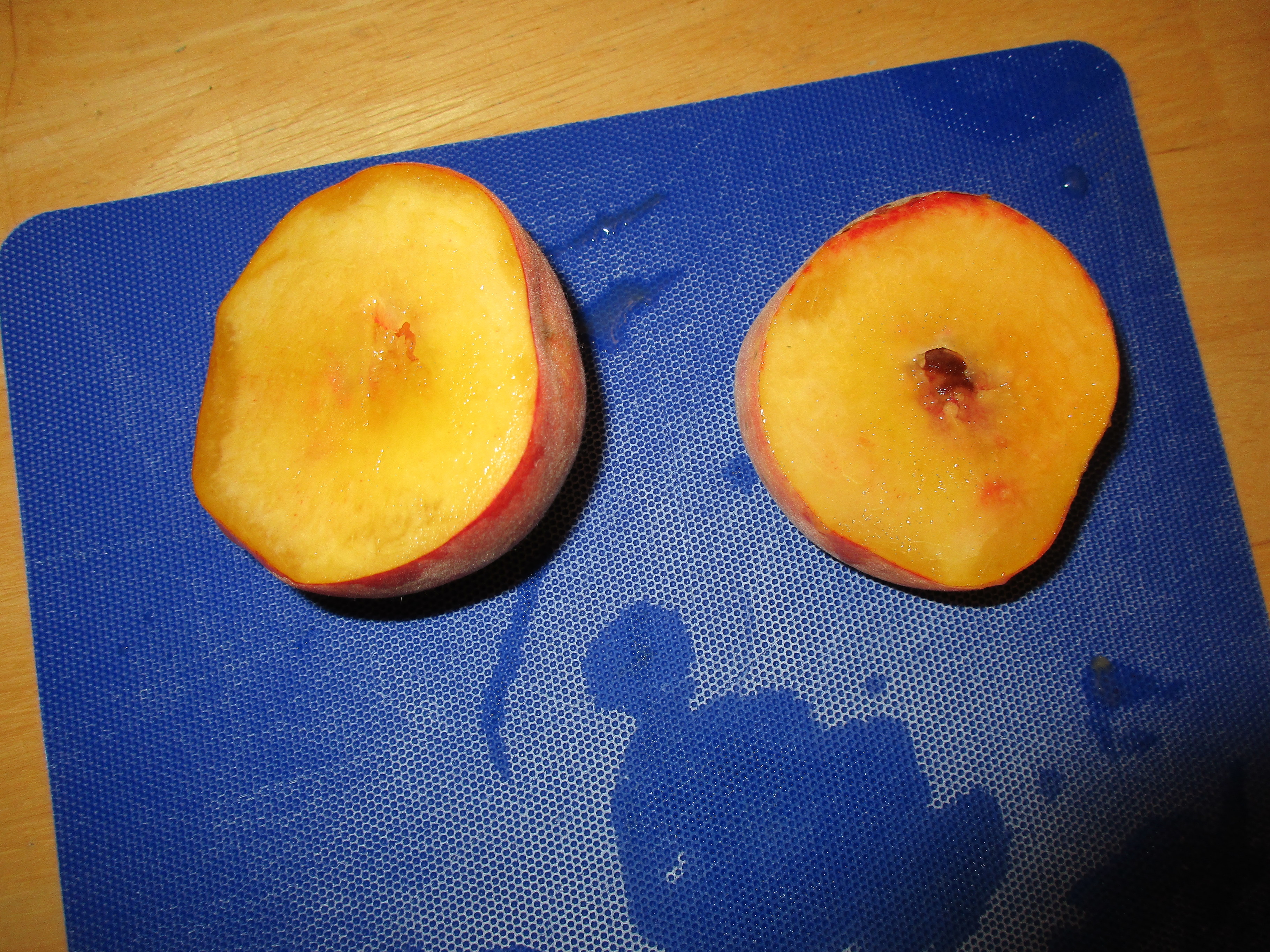 I have a little more than a dozen Redhavens netted and ripening. 3 were cracked so I picked them today. The ugly peaches and the nice looking ones are the same 3 peaches, just turned over. This is the first time I had a peach hit 17+ brix. Taste was excellent, A+. I keep the net up with 2 stacks of 3 ceramic disc magnets for each side. This tree has 2 sides held, but 4 would be ideal. I put a layer of Tyvek tape around each magnet to help with separating them.