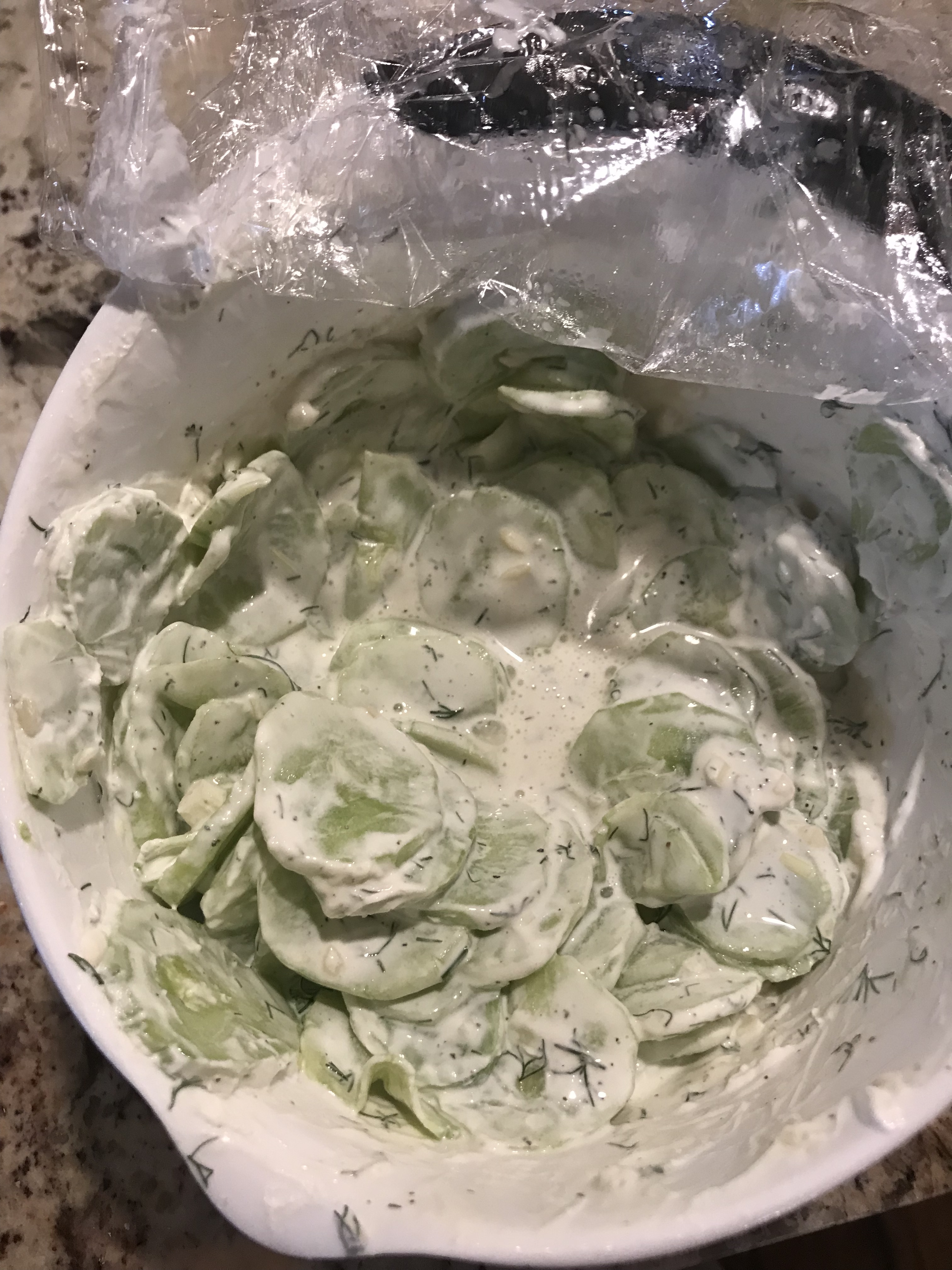 Chef buddy of mine served me these cucumbers and now there is always a bowl full of them in my fridge during the season. Peel the cucumber then split and seed it. Depending on the diameter you can cut it into fourths. Use a mandolin and slice the half’s very thin. Salt the slices liberally and put in a colander to drain overnight. Put the drained slice in a bowl and add juice from one lemon, salt, a tablespoon of chopped garlic, 2-3 tablespoons of fresh dill, and 1/2 cup of sour cream and 1/2 cup of plain yougurt. I usually do 5 large cucumbers and we eat it with most meals in the summer. My wife sliced these so they are neither halted or seeded but it makes a difference.