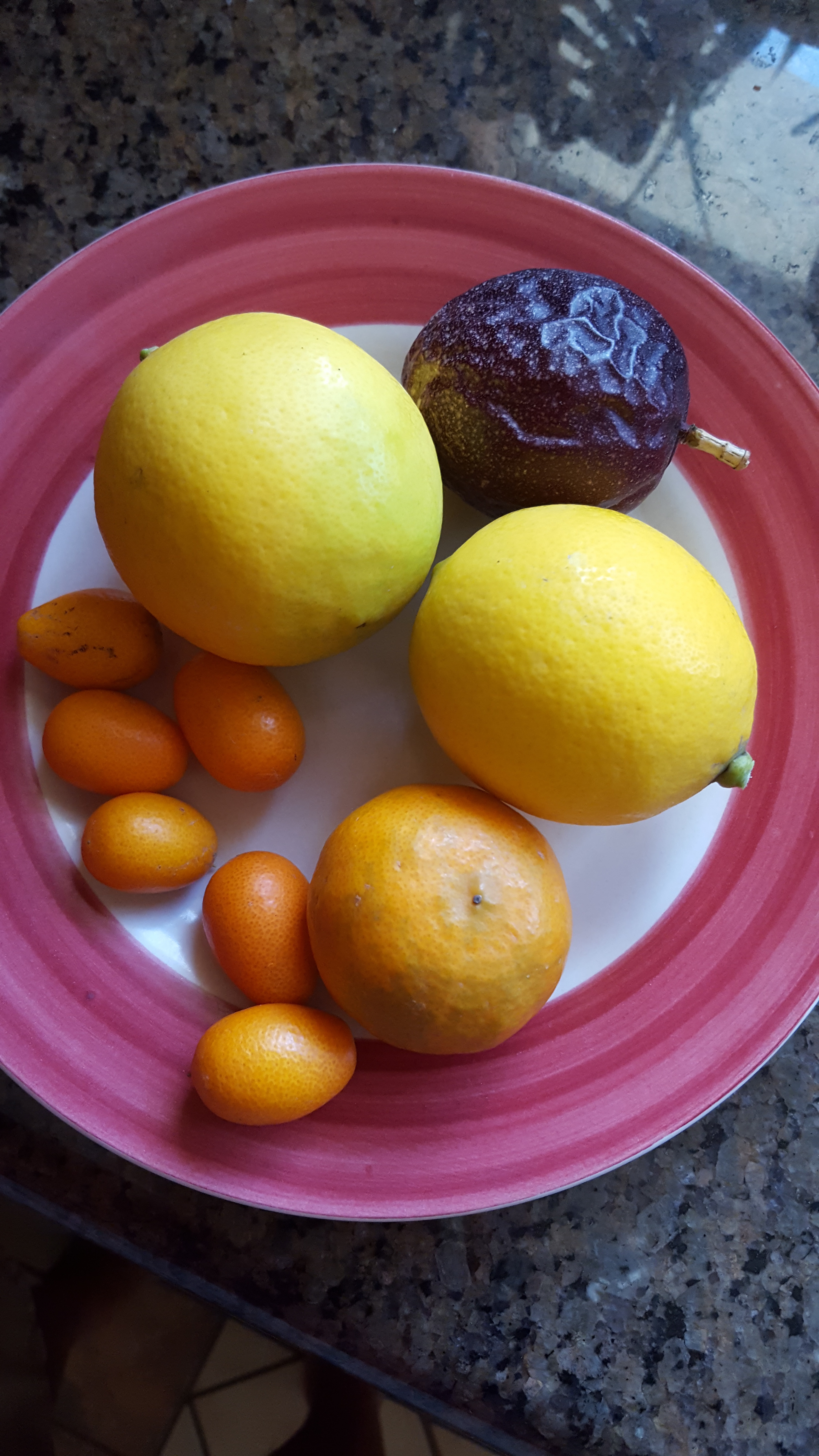A sample of what we are taking from our garden to the in-laws this morning. Lemons, Pixie tangerine, nagami kumquat, and passion fruit.