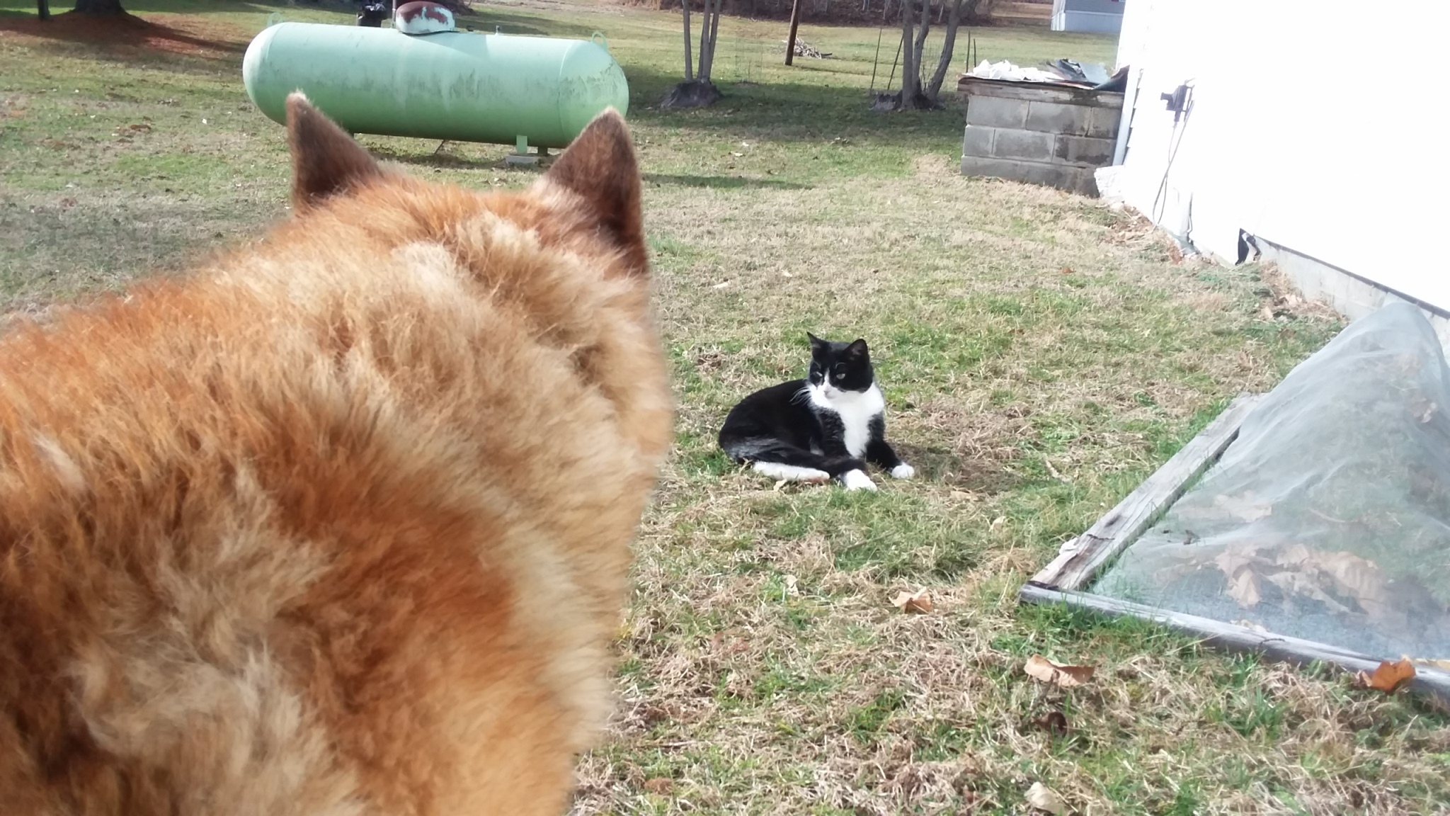 Our old dog, Bomber, pacing around, eyeballing the cat. I think he’s jealous.