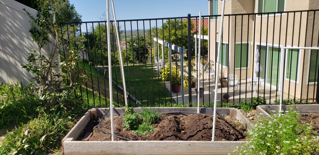 I bought a flat of mixed tomato seedlings and put 4 in the ground (Roma, Early Girl, Beefmaster, & Celebrity), I’ll give away the remaining two to neighbors. I also bought a single yellow cherry tomato and put that in. I have a volunteer red cherry tomato plant that popped up a couple of months ago, it’s already started to produce. I trimmed it back as it was starting to sprawl.