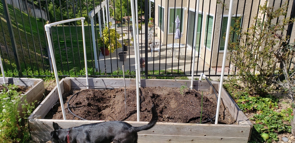 (That’s Shadow photo bombing the veggie bed! This afternoon I saw a bunch of suspicious footprints in the dirt, I’ll have to put up some wire fencing to keep her out.)
