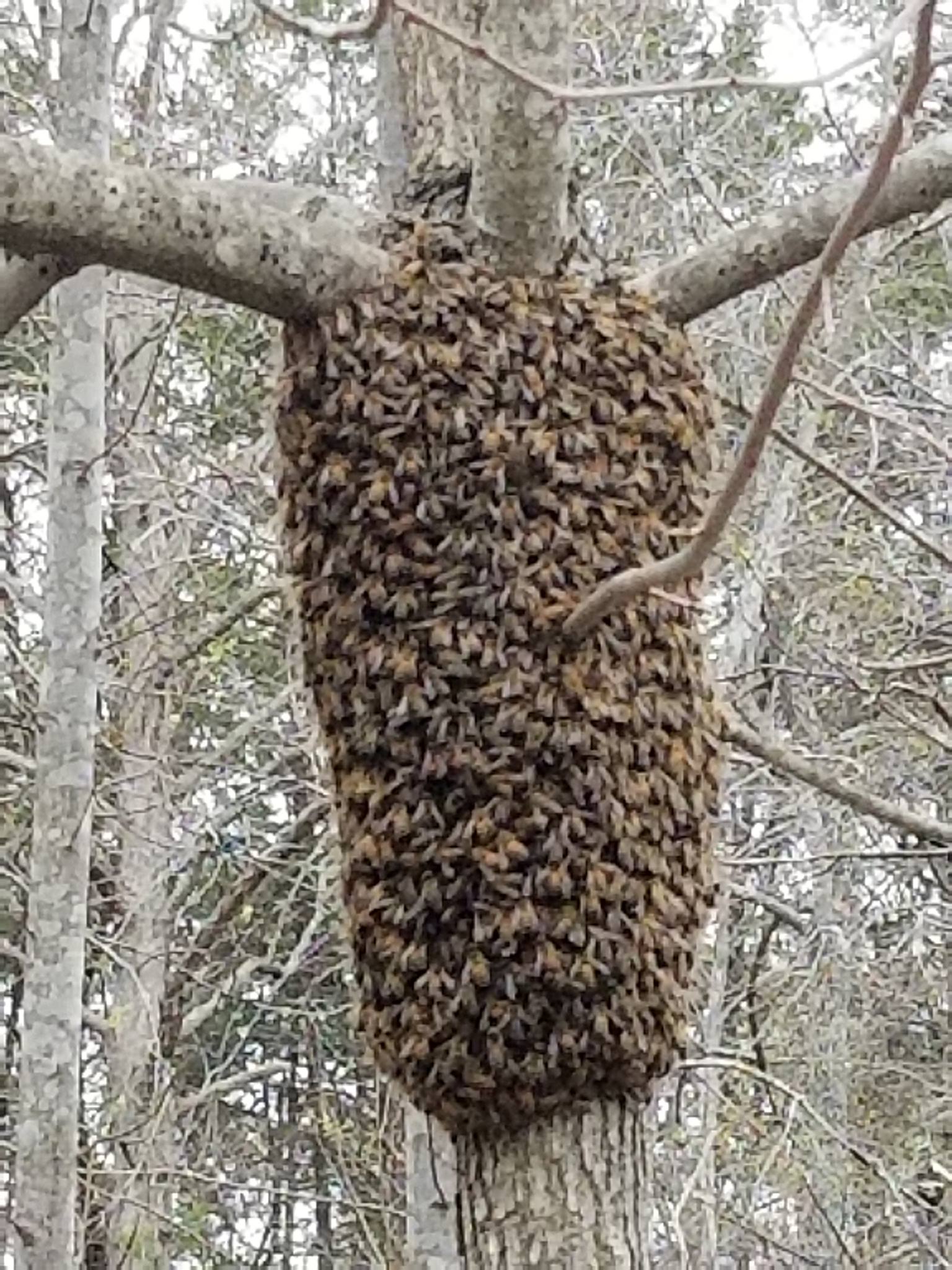 Pics of bees swarming along the edge of the woods at my house. Unfortunately my neighbor who raises bees was away this morning and the swarm had moved on by the time he could come and get the swarm.
