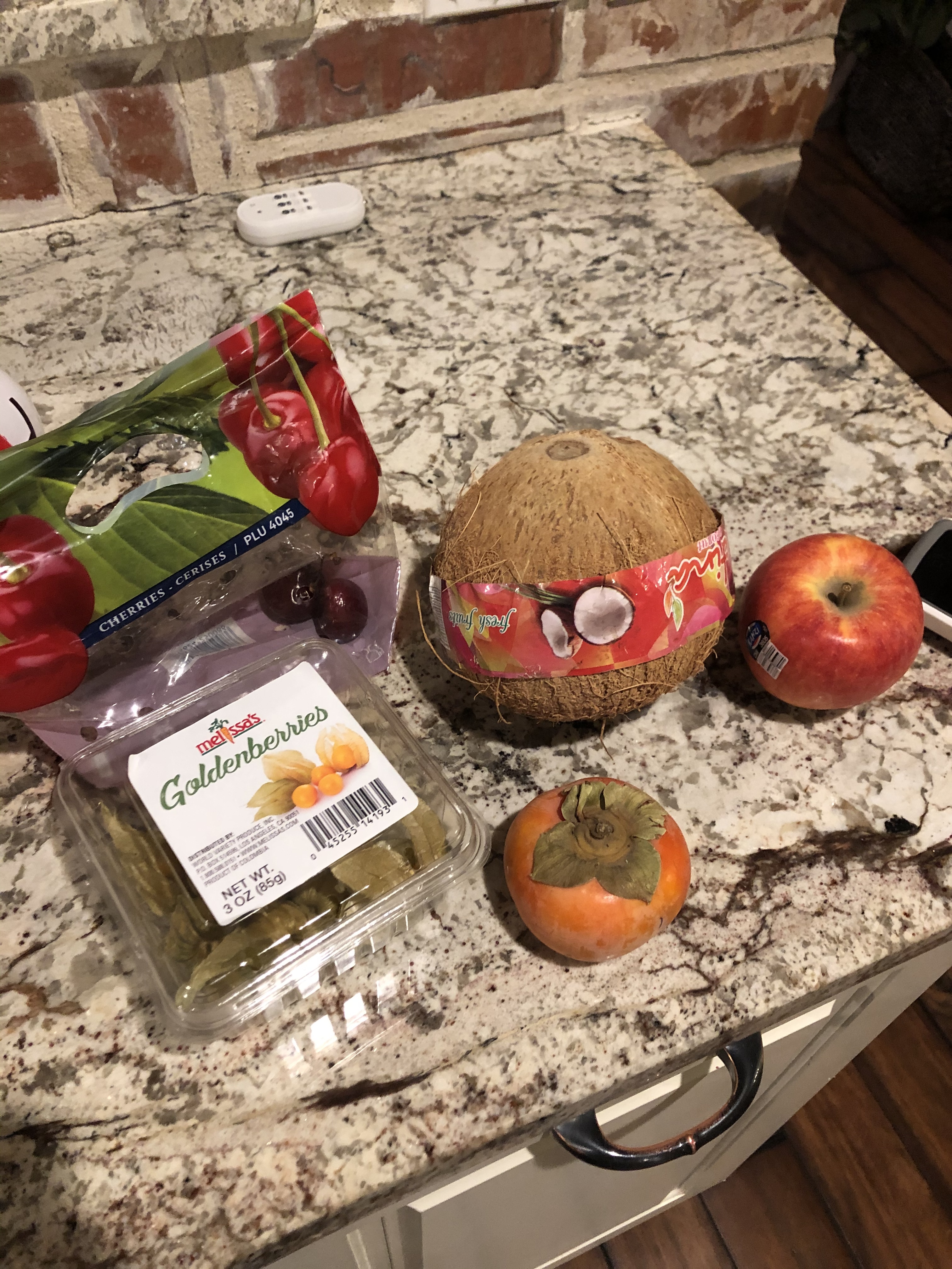 For Christmas my 8 year old got me a paper sack full of fruit. A Fuyu persimmon, a hachiya persimmon, some golden berries, a pound of cherries, a coconut and two different kinds of apples. I thought it was wonderful. I should’ve taken a picture before we grazed on it.