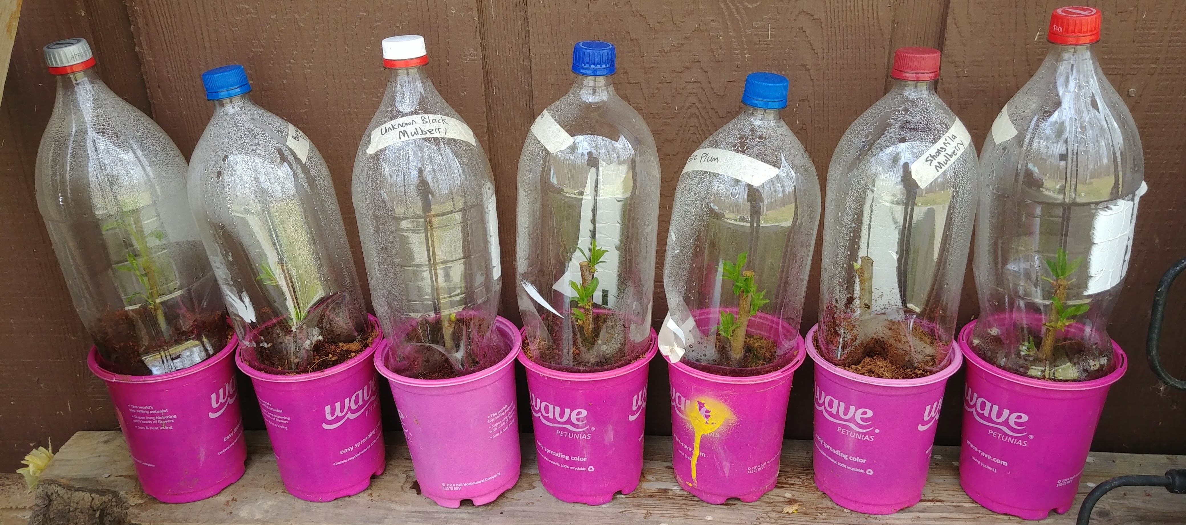 Experimenting with some hardwood cuttings… Two liter bottles just seemed like they would make acceptable “greenhouses”. I also put a bunch in a large clear plastic “tote”. All are in coconut coir and out of direct sun. The unlabeled ones in the tote are M111 cutoffs where I used the roots for interstem grafting. Figured what the heck, lets see if they might grow… Others are all plum and mulberry. First time being fairly serious in an attempt to do this, fingers crossed.