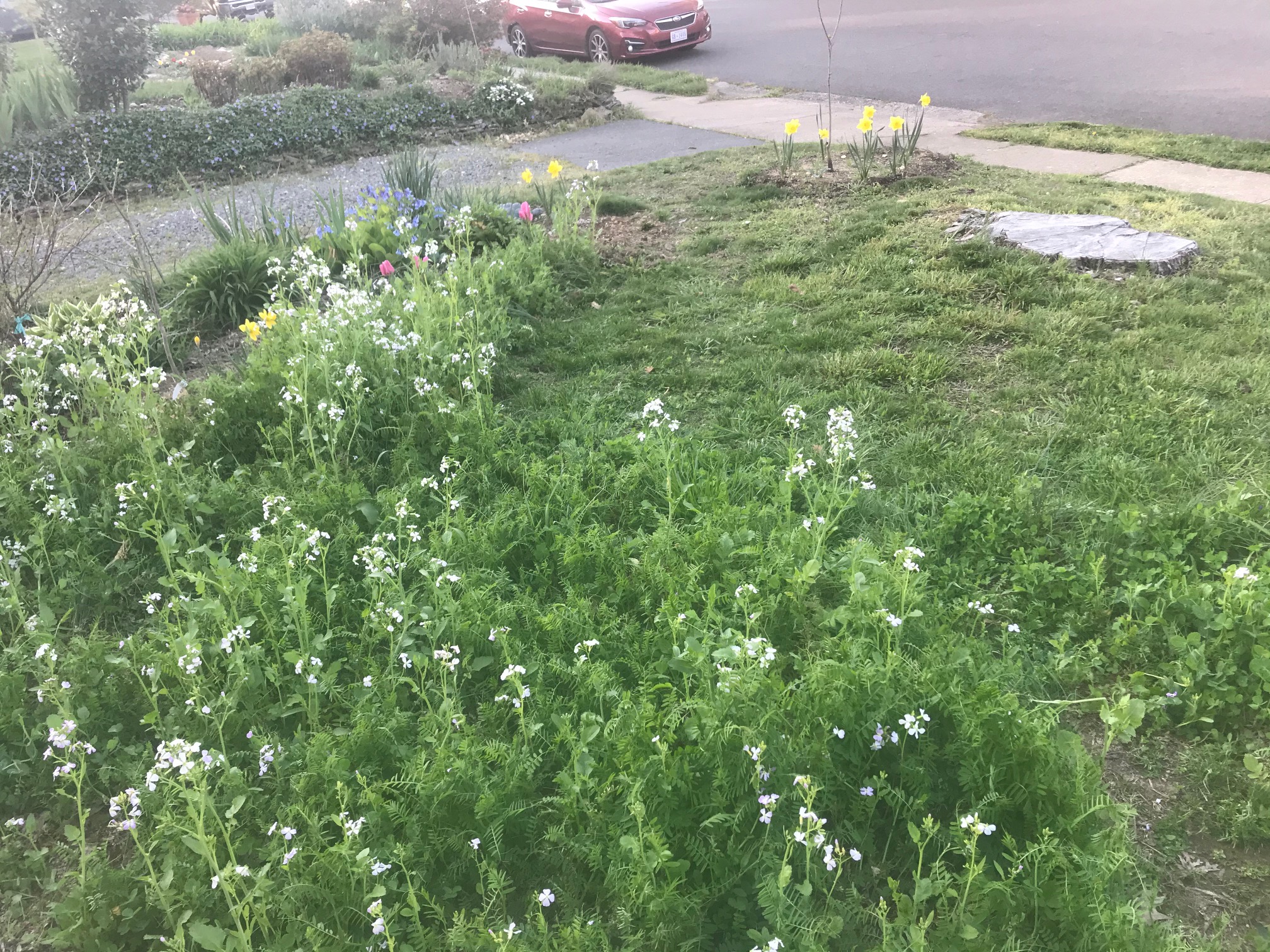 I planted a cover crop last November for an area of lawn I’m turning into garden space. I used a mix of hairy vetch, crimson clover, daikon radish and Austrian winter peas. Now that we’re trying to avoid trips to the grocery store it has turned into a nice source of greens. Here is a salad made with pea shoots (delicious), daikon leaves and flowers (also a surprising delight), plus a few flowers from the wild violets that show up uninvited in the garden. A few walnuts and some dressing and it was ready. Now I’m not sure I should cut it down to plant other stuff yet.