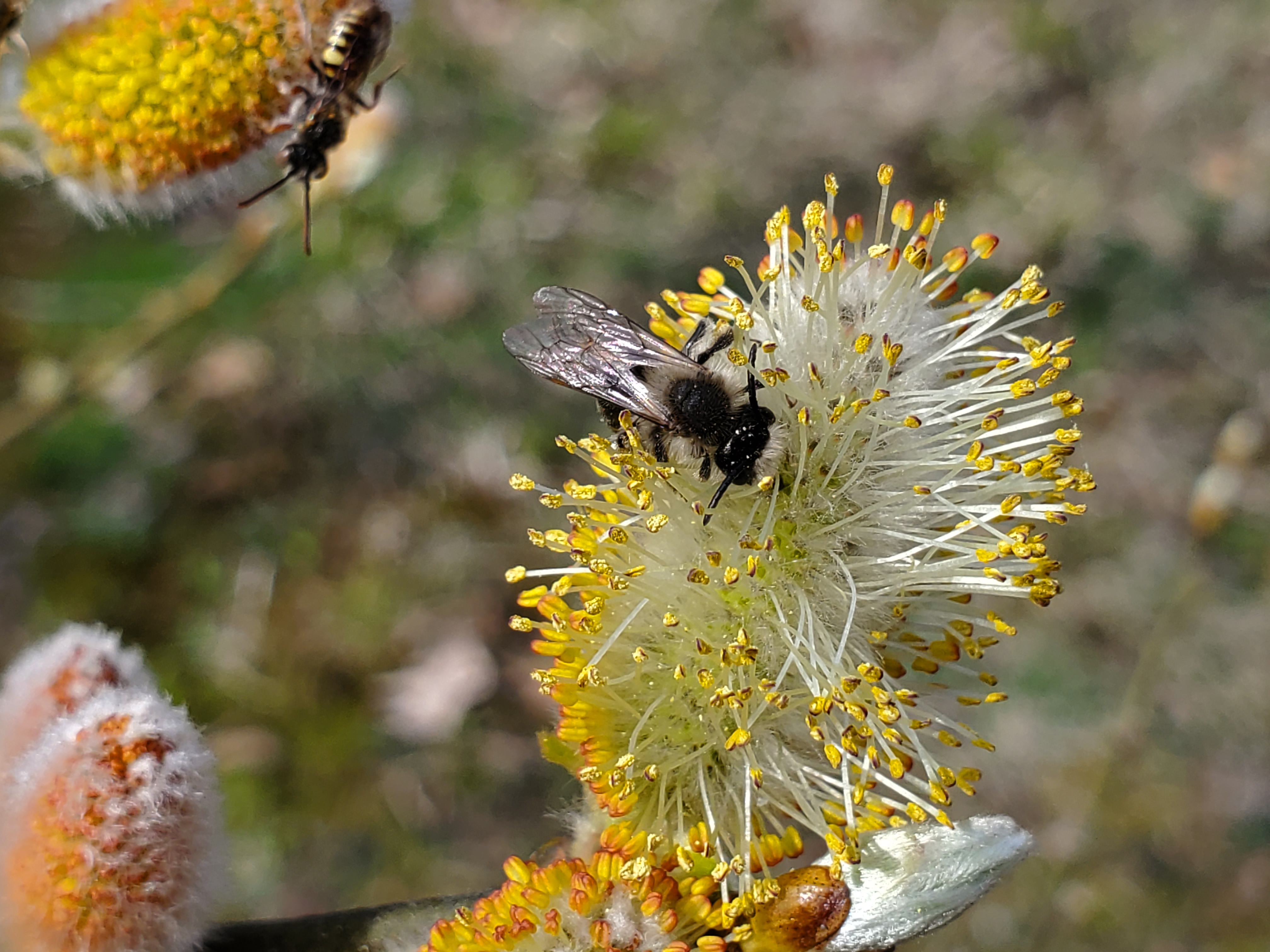 Solitary bees showed up this week, and are having at the pussywillow.