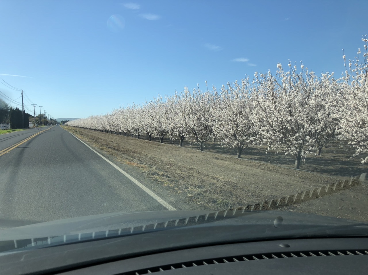 My neighborhood is surrounded by commercial almond orchards on all sides. Almond trees are in bloom right now.