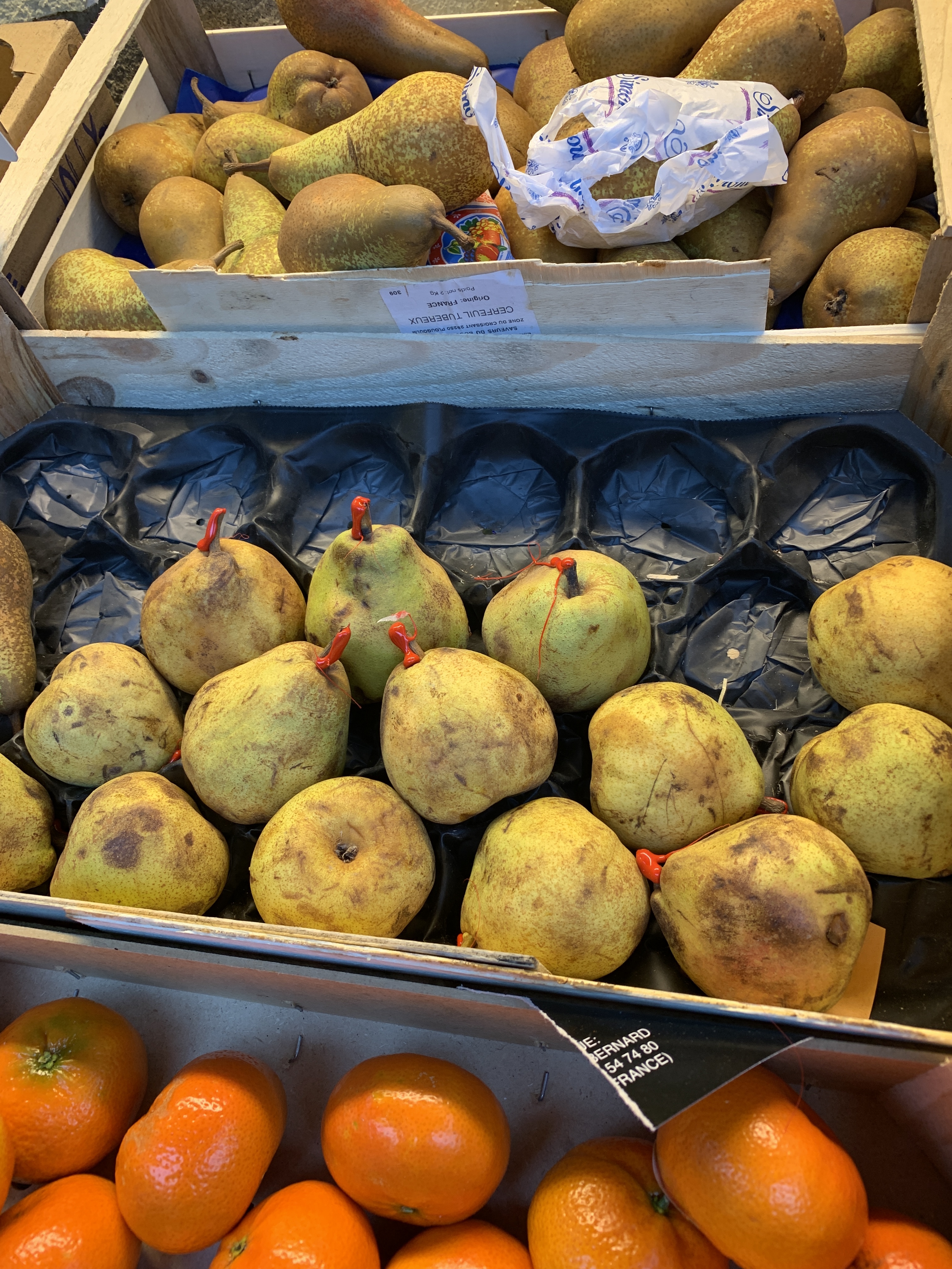 The produce here all looks perfect and tastes really good (except for the apples and pears). Since many of them are used in cooking they don’t care about outward appearance. This is interesting though, see what they do to the tips of their pears to keep them fresh.