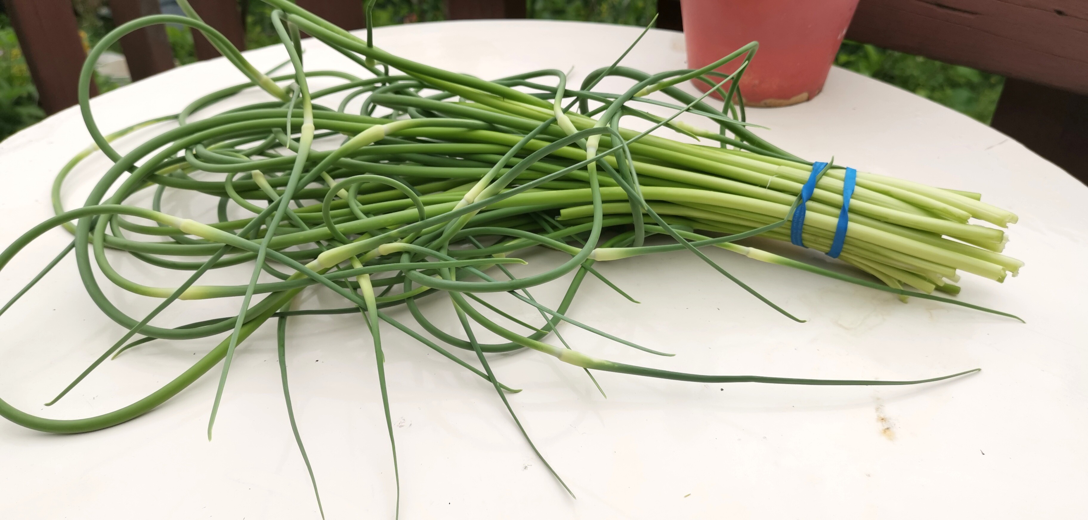 Got 5 pints, now off to dice the flowering ends of the scapes into the dehydrator.