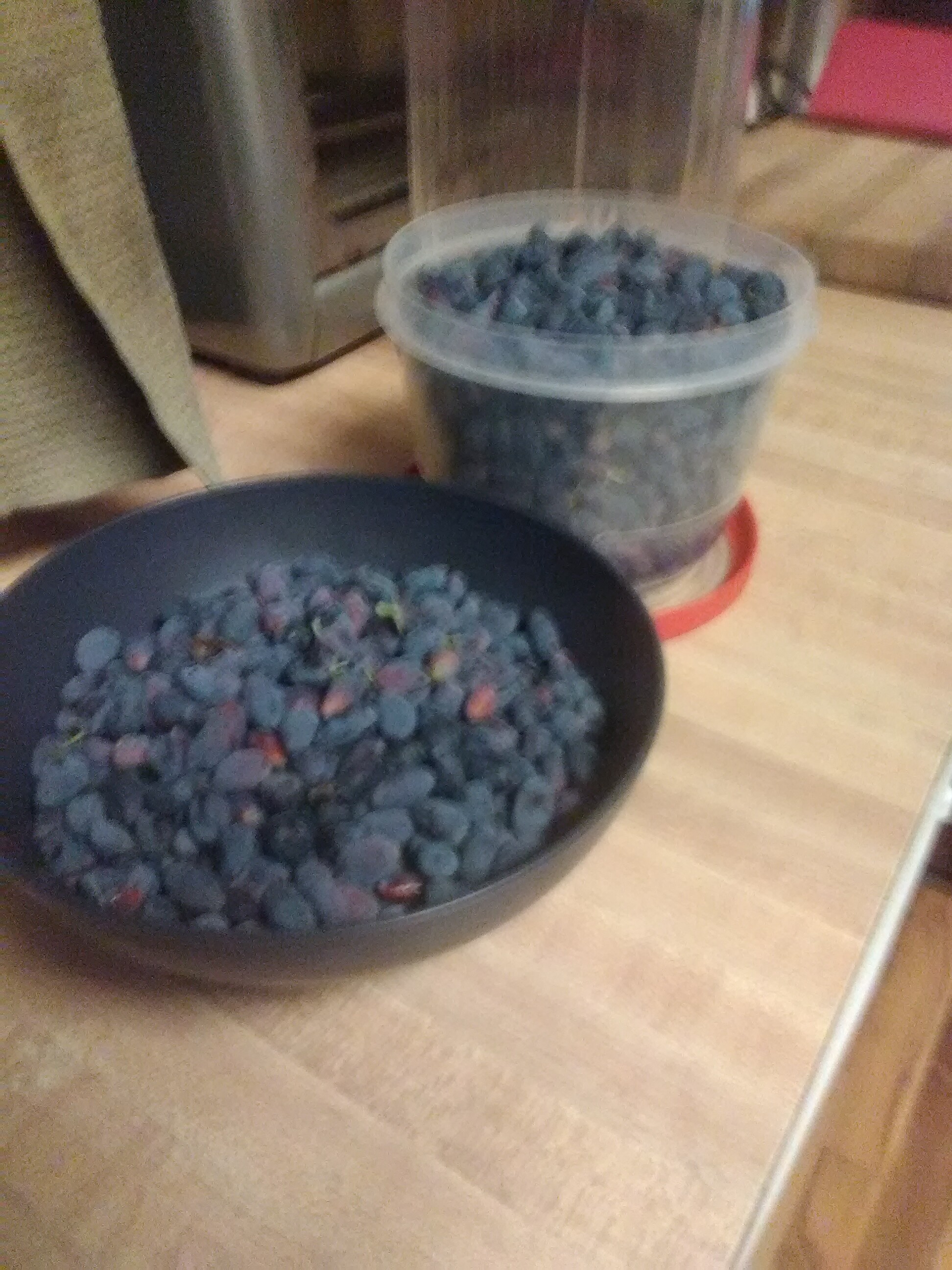 2 lb. haul today, 3 and a half so far this year. I have to say, they are a lot of work to pick! Next year when they are a bit bigger I will try the sheet and beat strategy. . .