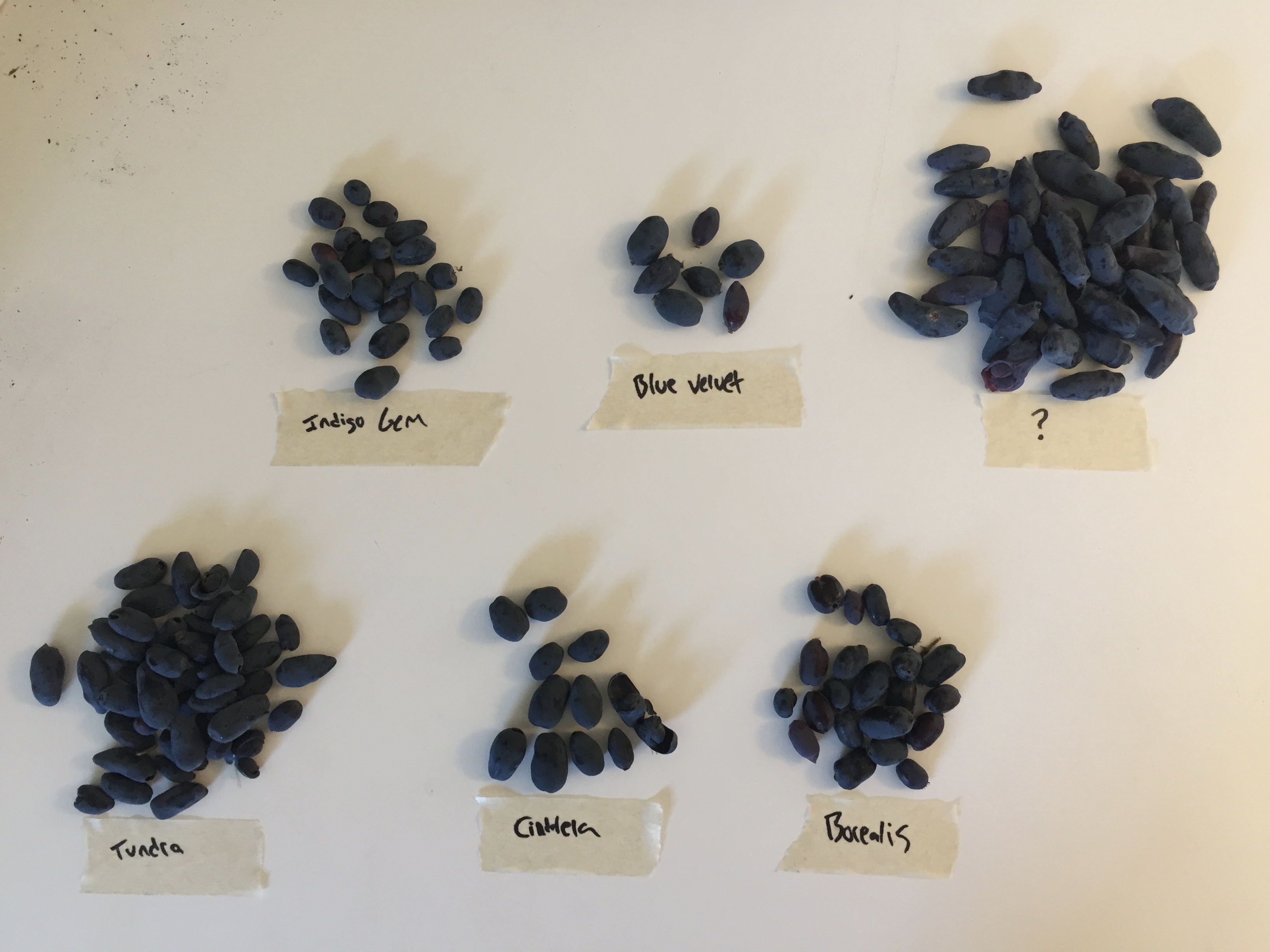 I did a honeyberry taste test with two other people today and here’s what I came up with. Some plants are three years old, some are four. I didn’t try to protect them from birds. What you see is the yield of each plant. I should also add that we’ve had an exceptionally rainy spring, so that probably had an effect on flavor.