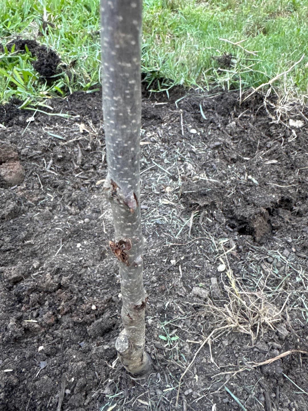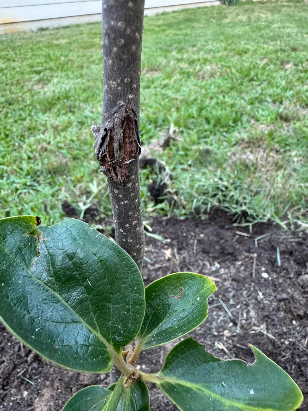 There is wood chipping off the trunk and this weird spot on my very young persimmon tree. I planted it a couple months ago, and it seemed to be fine, but recently ive been seeing more of these spots and wood chipping off the trunk. What is going on with it and what can I do to help it?