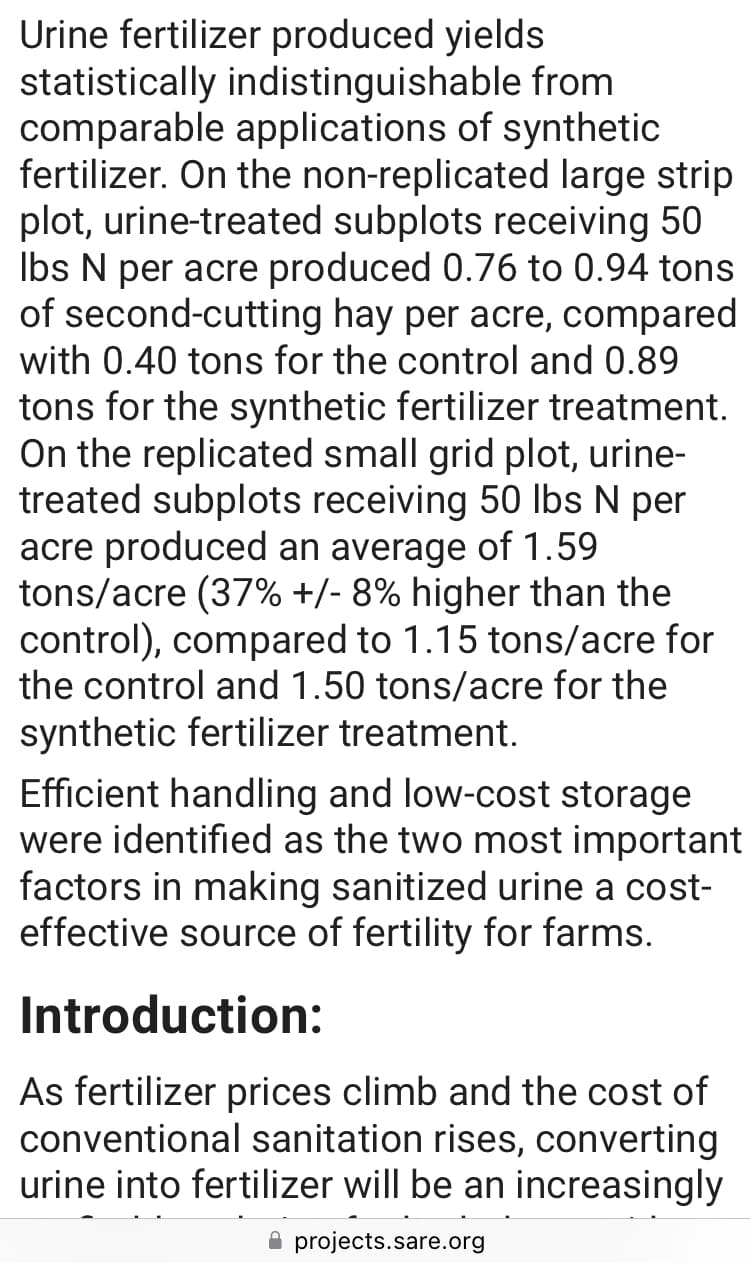 I don’t mean to be ideological or purist. To me its not about ideology, but about ergonomics. The merits of this idea dont hinge upon it being done at scale, either, though I think most ideas as pragmatic and commonsense would lend themselves to that, provided the correct groundwork were laid. There are all manner of pragmatic reasons against scalability too, though those would tend to center around sunk cost and legacy infrastructure. On a grand scale, in for example an urban environment, it may not be worth the bother. This thread is about fertilizer that is “low cost” and “organic” though, so we hardly need to consider that scale. With few exceptions, Id venture that people reading this thread are not in a position to put others at meaningful risk from this practice. By and large, people here are growing fruit, whether on trees, bushes, or canes. These are inherently compatible with urine, as are grass and cereal crops of any stripe, whether for forage or human consumption. So to are many (most) vegetables, especially considering that application is easily withheld within a reasonable window prior to harvest. We have such conventions for substances far more dangerous, like pesticides, so why overemphasize the pathogen risks from urine? The fact is, they are low and easily mitigated.