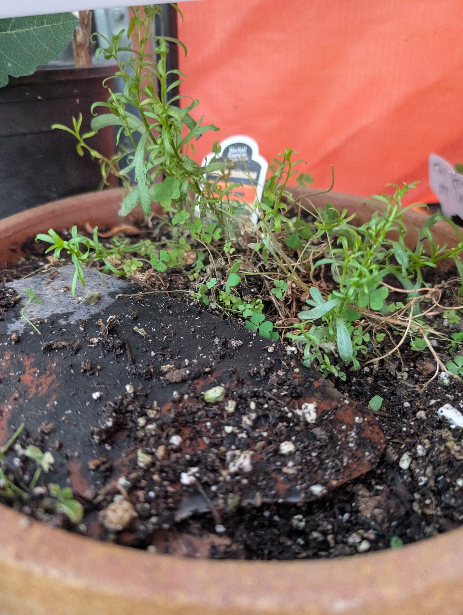 I got some nursery starts of lemon thyme (3), rosemary, sage, and parsley and am trying it in the retaining wall facing the kitchen window so there’s a strong reminder to go get herbs. Otherwise we forget. I don’t think there’s enough light or soil, but if it works it’ll be a home run. Sage already has p mildew and the rosemary looks pathetic but the thyme and parsley are doing nice