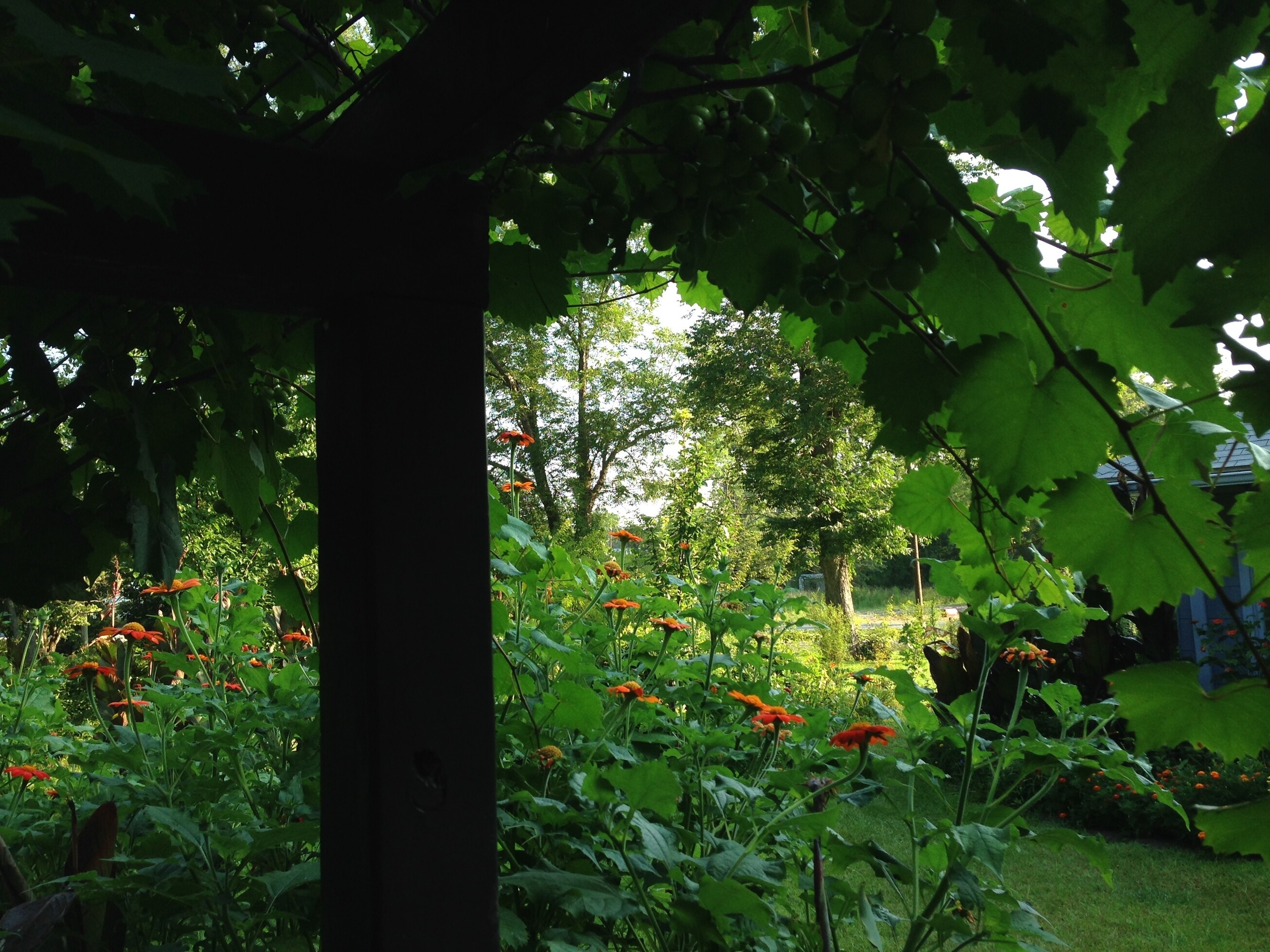 Here are a couple of pics from last summer. One is of what you see when you are looking from backyard vineyard part of my orchard toward the house. And the other depicts how the flower beds next to the swing arbor looks in late summer.