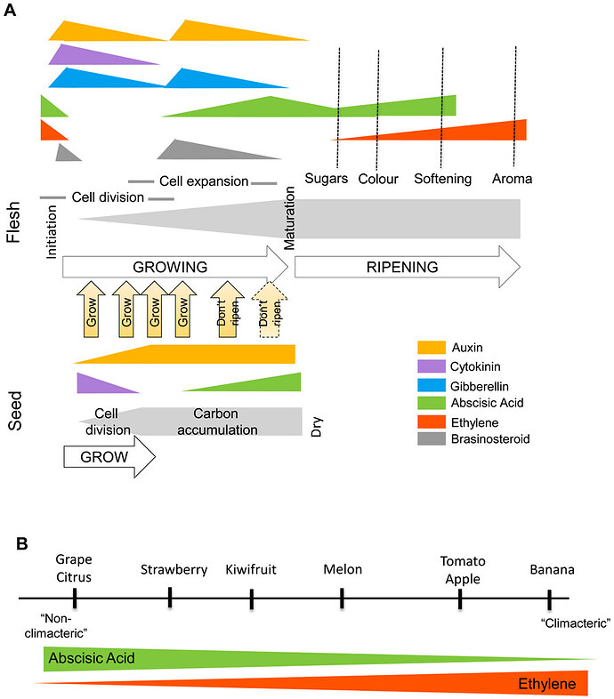 The role of cytokinin during fruit maturation is less well documented but cytokinin-deficient Arabidopsis fruit show non-synchronous ripening with fewer viable seeds compared to controls suggesting cytokinin also has a role in the regulation of silique maturation and ripening (Werner et al., 2003). Finally decreases in free cytokinin and auxin levels are also observed before ripening in orange and grape (Minana et al., 1989; Bottcher et al., 2011).