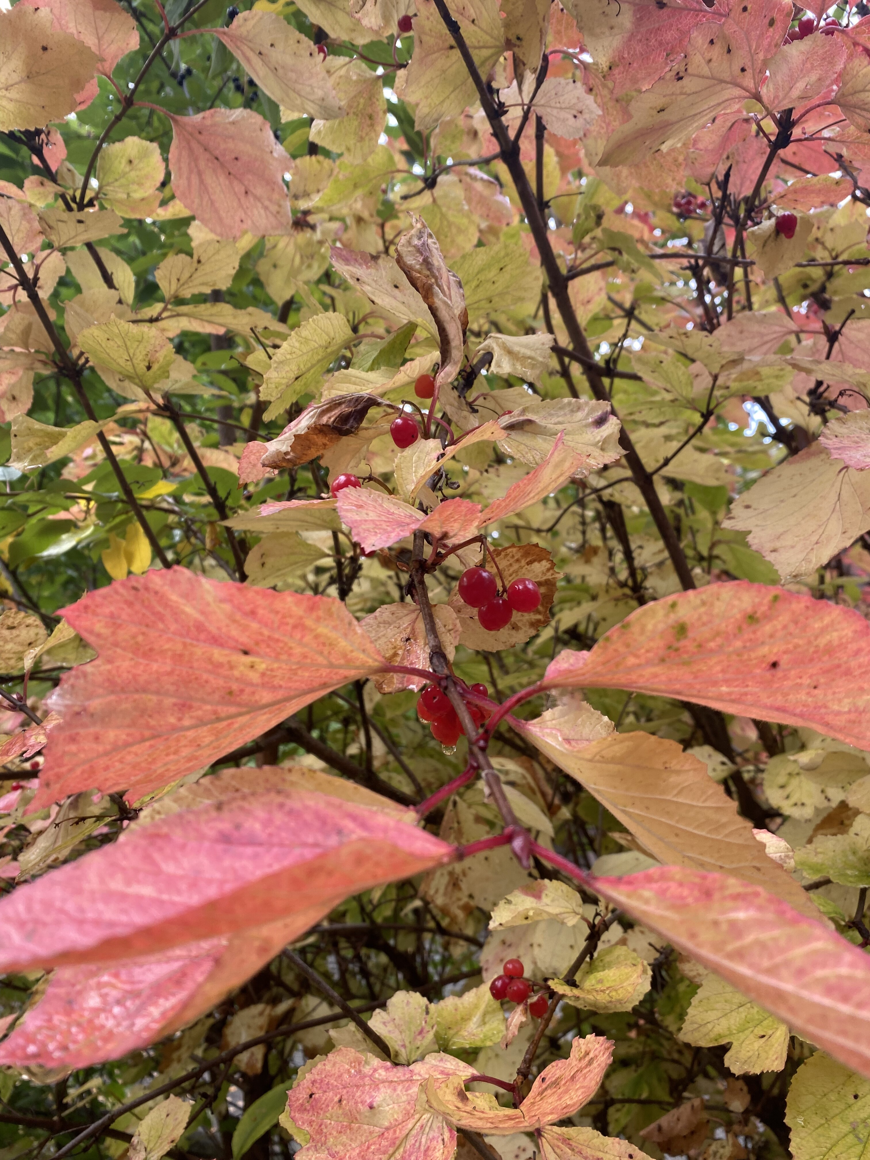I have the Phillips cultivar of viburnum trilobum…but they came bare rooted last spring out of 4 inch pots. So, no fruits, but I’ll be looking for some good fall color as they’re filling a one gallon pot pretty much.