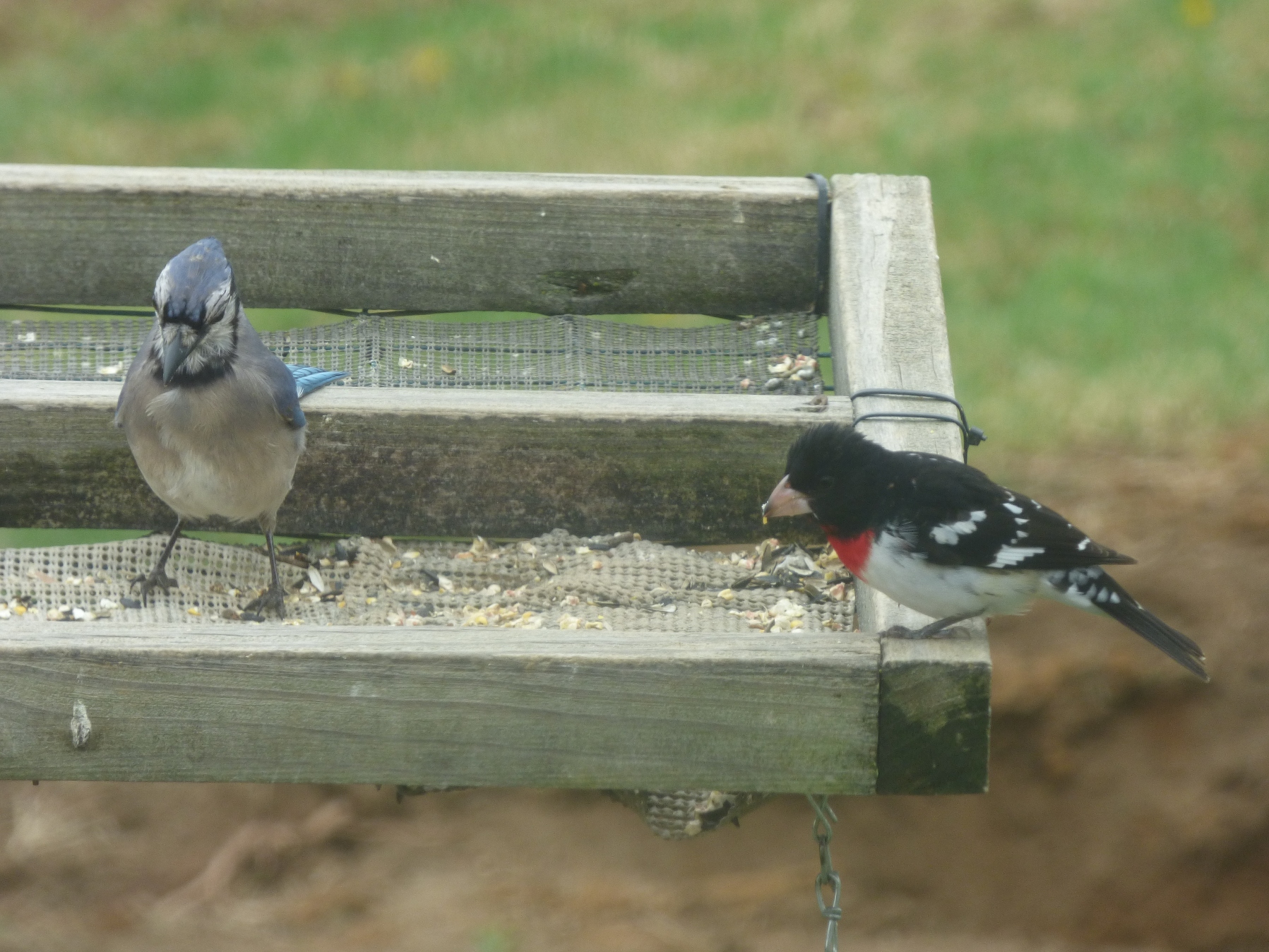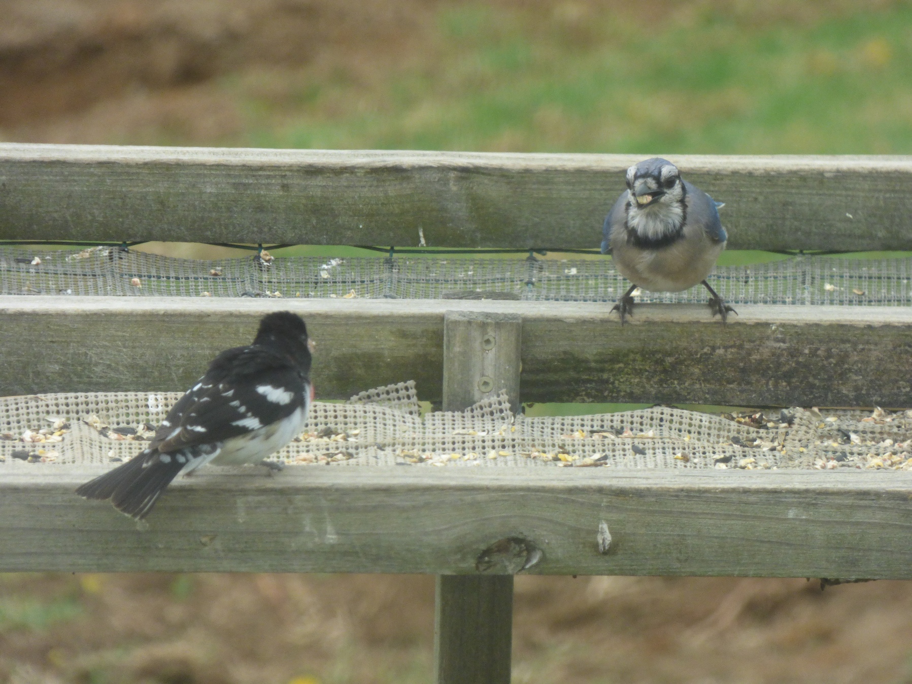 The Grosbeak was hopping around trying to be boss.  That Blue Jay didn’t give a hoot about it.