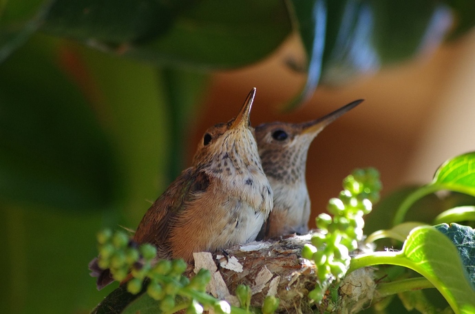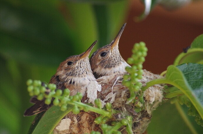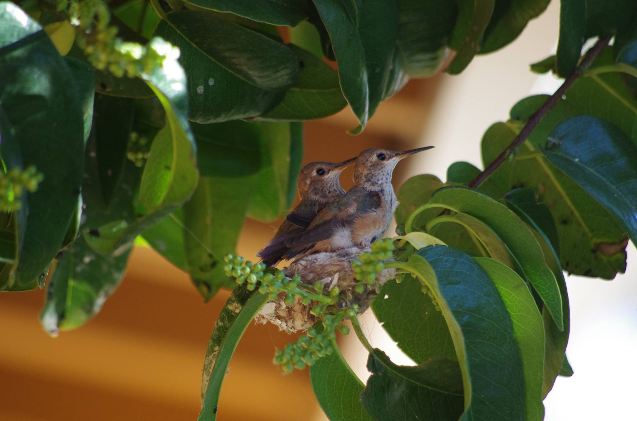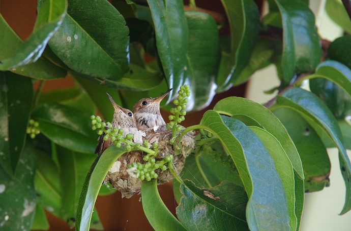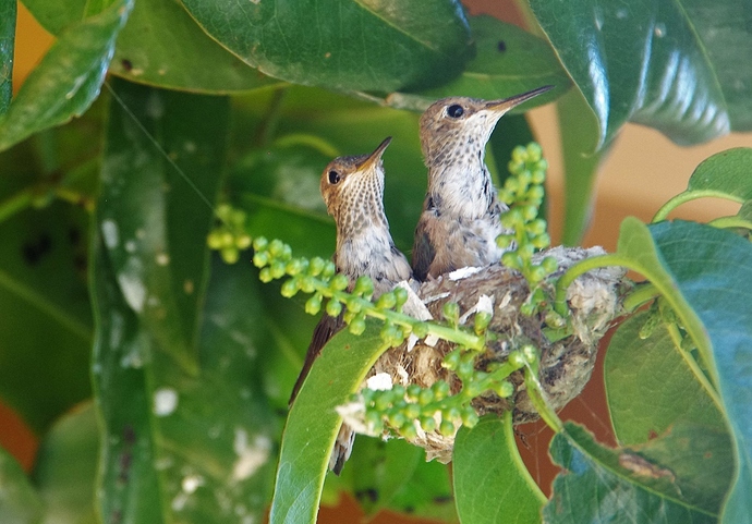 Looks like they’re just about ready to fledge. Hummingbirds fledge at about age 3 weeks, so within the week they’ll be off and flying on their own, and mom will be getting ready to lay a new clutch in that nest!