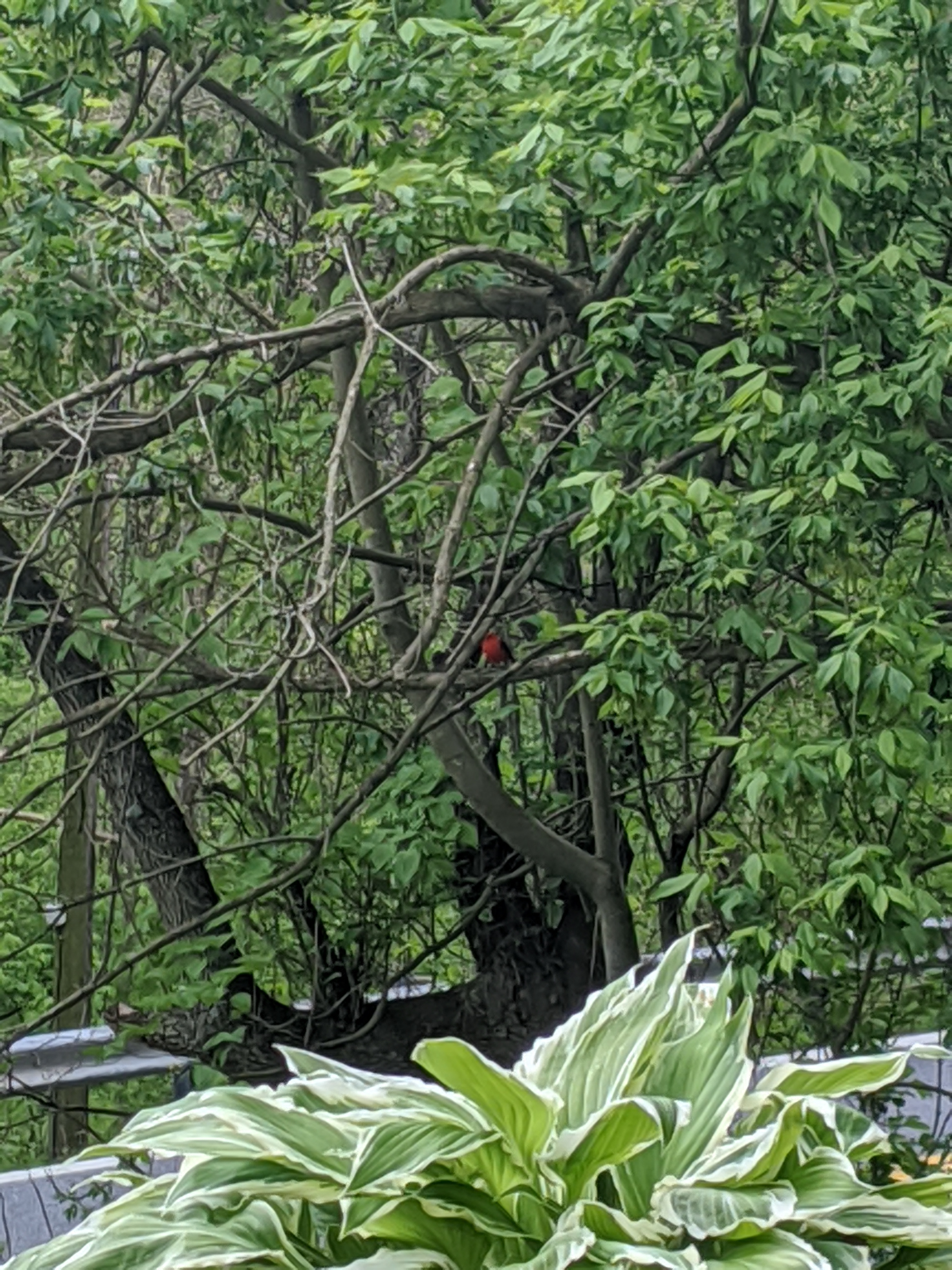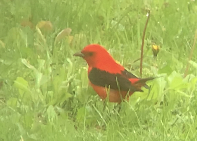 A couple Scarlett Tanagers were spotted in our yard today. It’s not a great shot even though they let us walk up close to them.