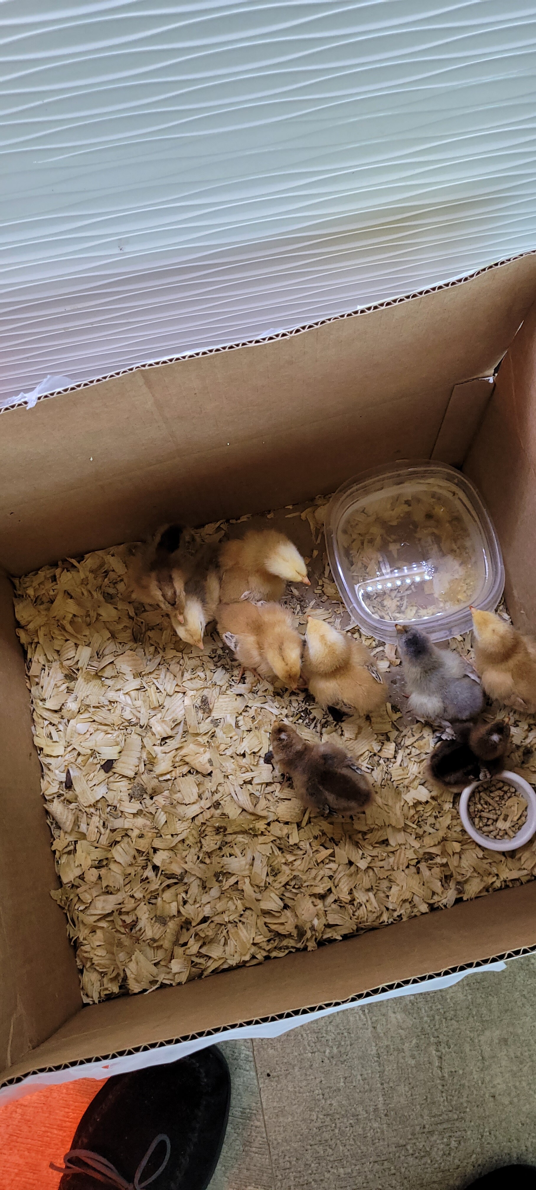 2 Bielefelder. 6 big Red Murray and one mystery. McMurray will send a mystery unsexed no identified breed for buying 6. Hopefully it’s not a rooster. I have 2 roosters and that’s plenty.