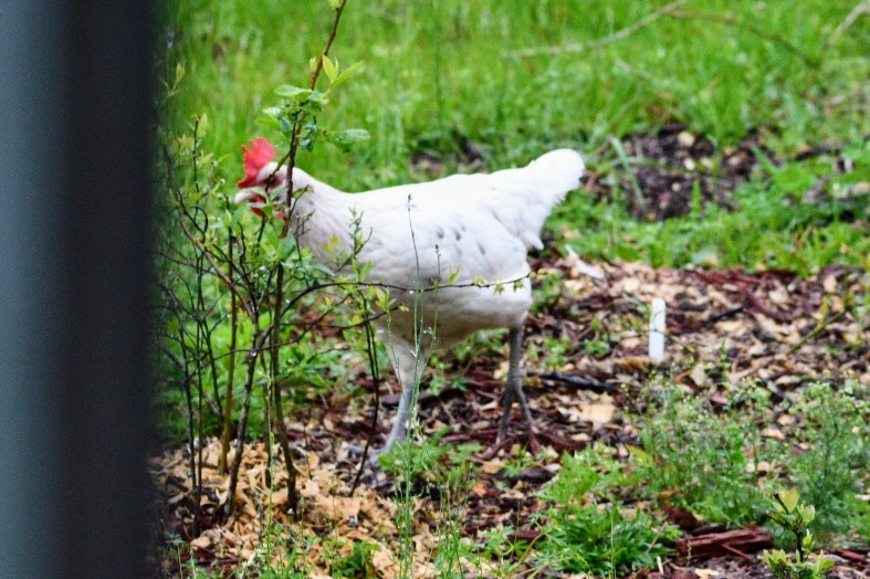 My chickens will have to be reined in somehow or my garden will need fenced. They are loving it right now. The white hen is in my blueberries