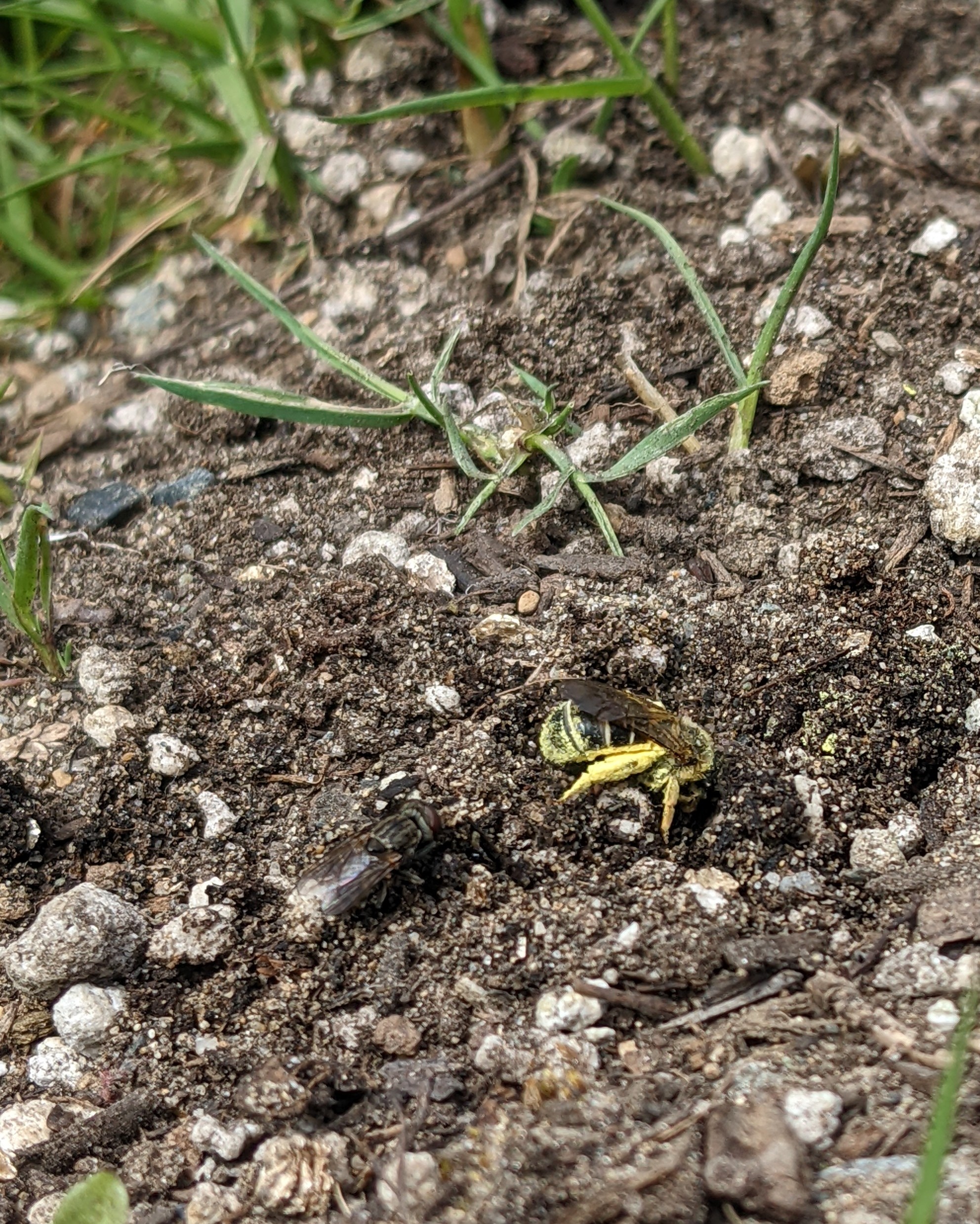 Miner bee studiously re-excavating its burrow after I carelessly collapsed it while weeding today: