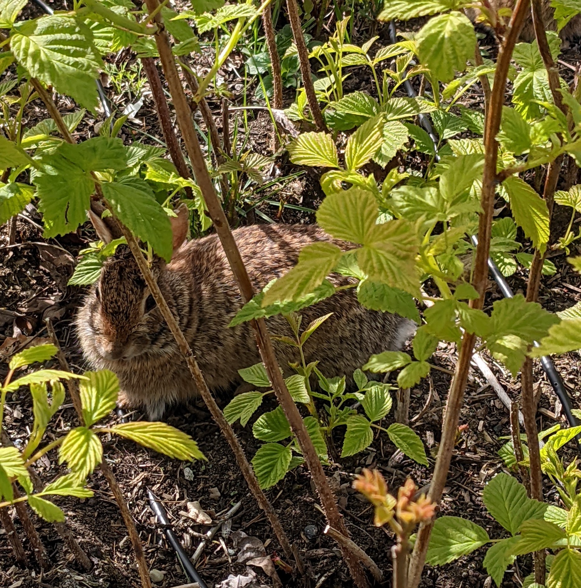 Not my own garden, but our neighborhood is infested with suburban rabbits, this one is hiding in a neighbor’s raspberries in the right of way. They rarely come in my yard, though, guess they aren’t a fan of our porch cat.