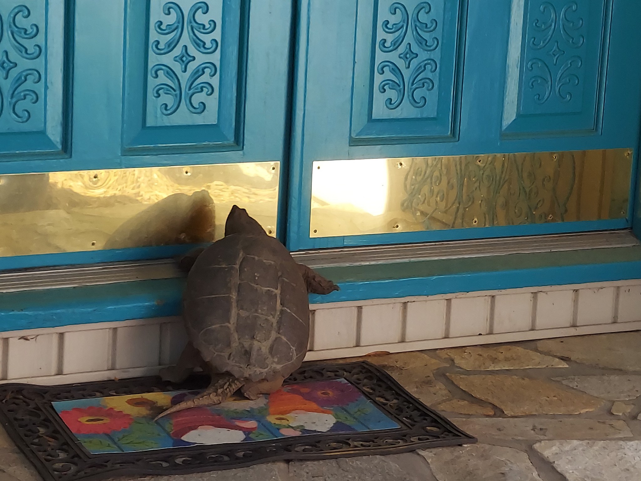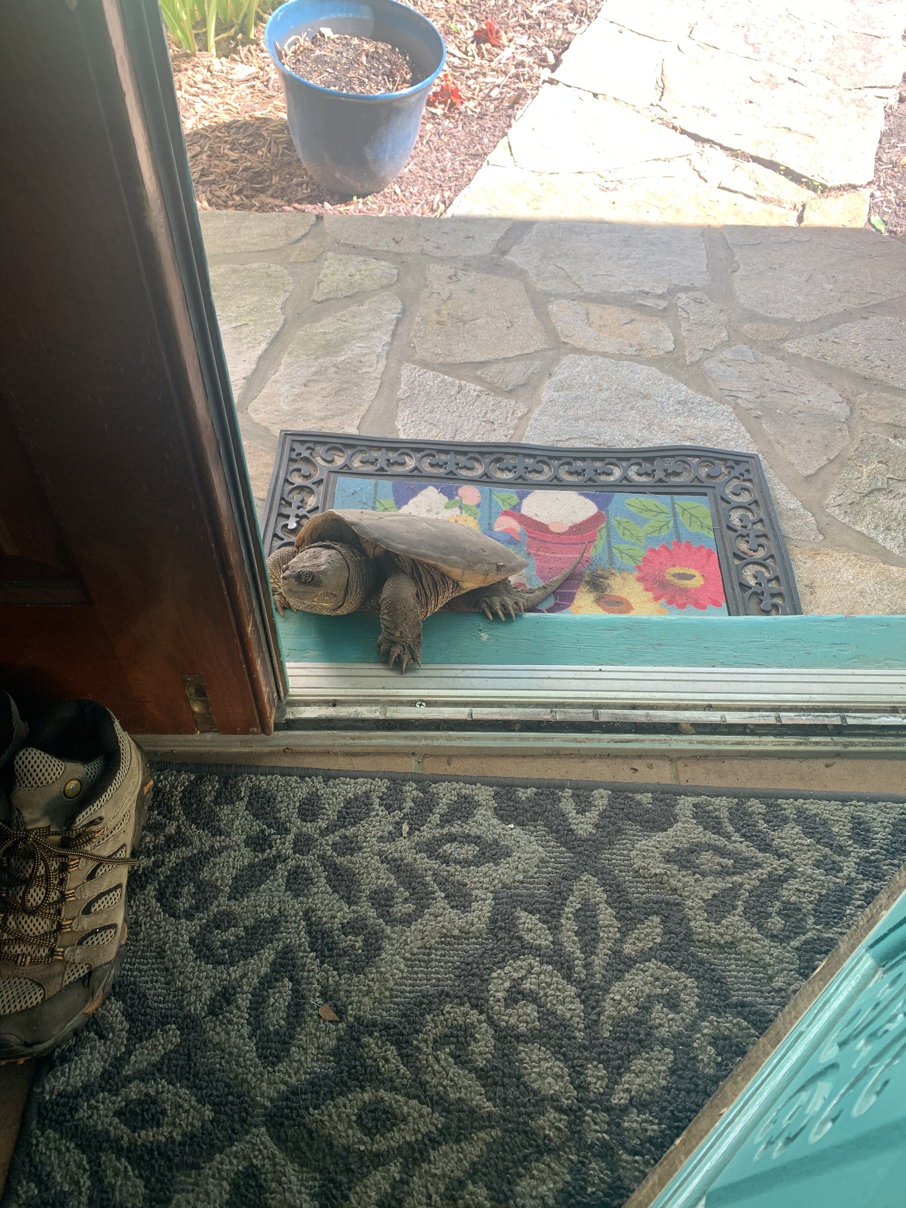 Although this is only garden in the background, I am sharing this story with everyone I know. We heard something scratching at our front door this morning. And found a large snapper trying to get in! Or really, trying to get home but our house was between her and the pond. FTR, I live in suburban Maryland