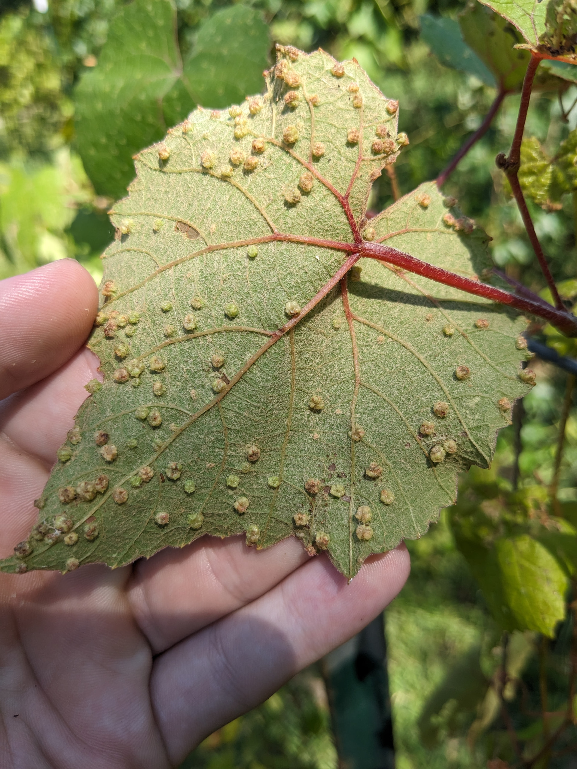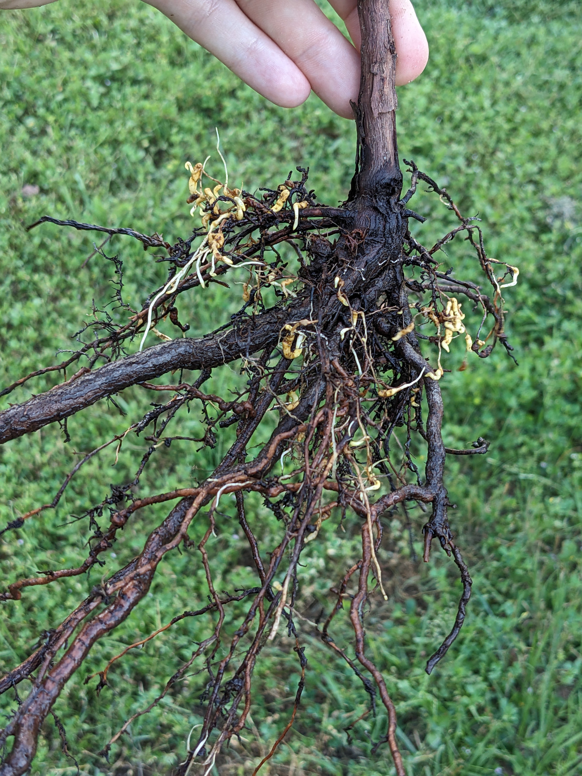 In my own plantings, starting in fresh, grape free ground, it took about 11 years before I started seeing phylloxera show up on the roots, but now it’s in my soils and I see it a lot. It was in my region the whole time, just not in my particular soils because no host had been present. I plant and pull seedlings every season so I see roots a lot, and noticed it right away when it started to show up. For my purposes, I am glad to have it, because that helps me select for tolerant seedlings, but if you are growing for fruit, it’s death on suceptible types once it’s there. Rootstock is a super simple and cheap preventative measure, so for a vineyard, using rootstock if the cultivar is susceptible is just common sense to protect a significant investment. For a backyard grape in fresh soils with no history of being planted in grape, eh, up to you. If I cared about keeping it alive long term I would still get it on a rootstock myself, but the investment is small, so if you feel like taking a chance, you are risking far less, and you can often get away with it with just a vine or two for a long time. I’ve added a couple of pics of it on leaves and roots so people will know what it looks like.