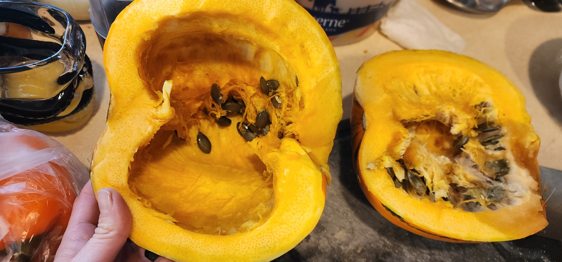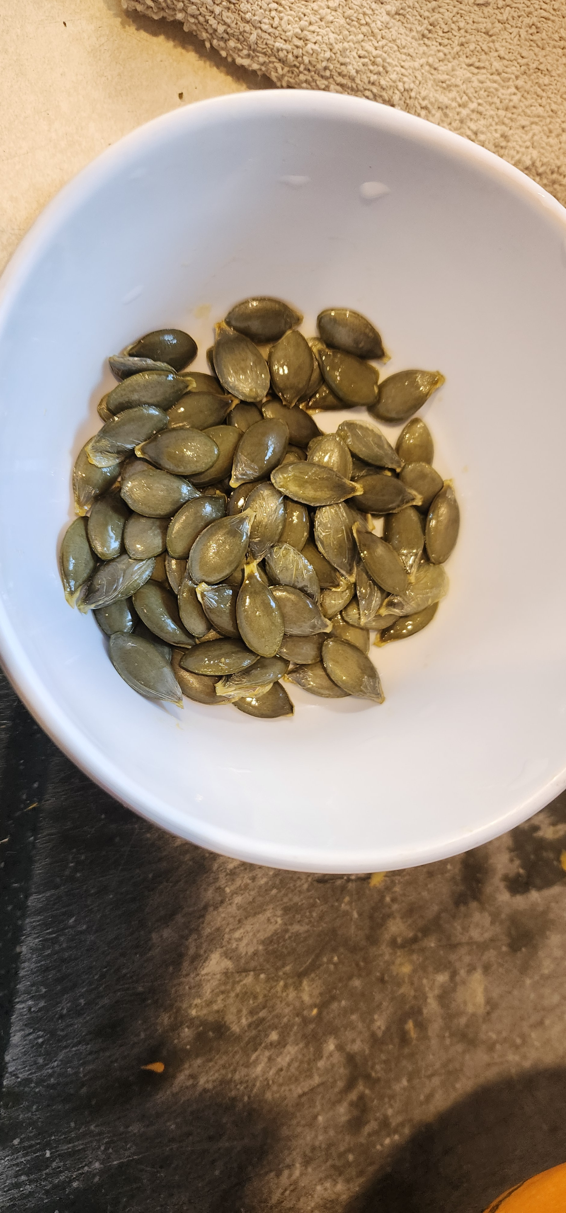 Not a many pictures as I thought. I roasted this one, a different one with orange skin (and the seeds had hulls!) I tried in soup. It was only better in that I could eat it.