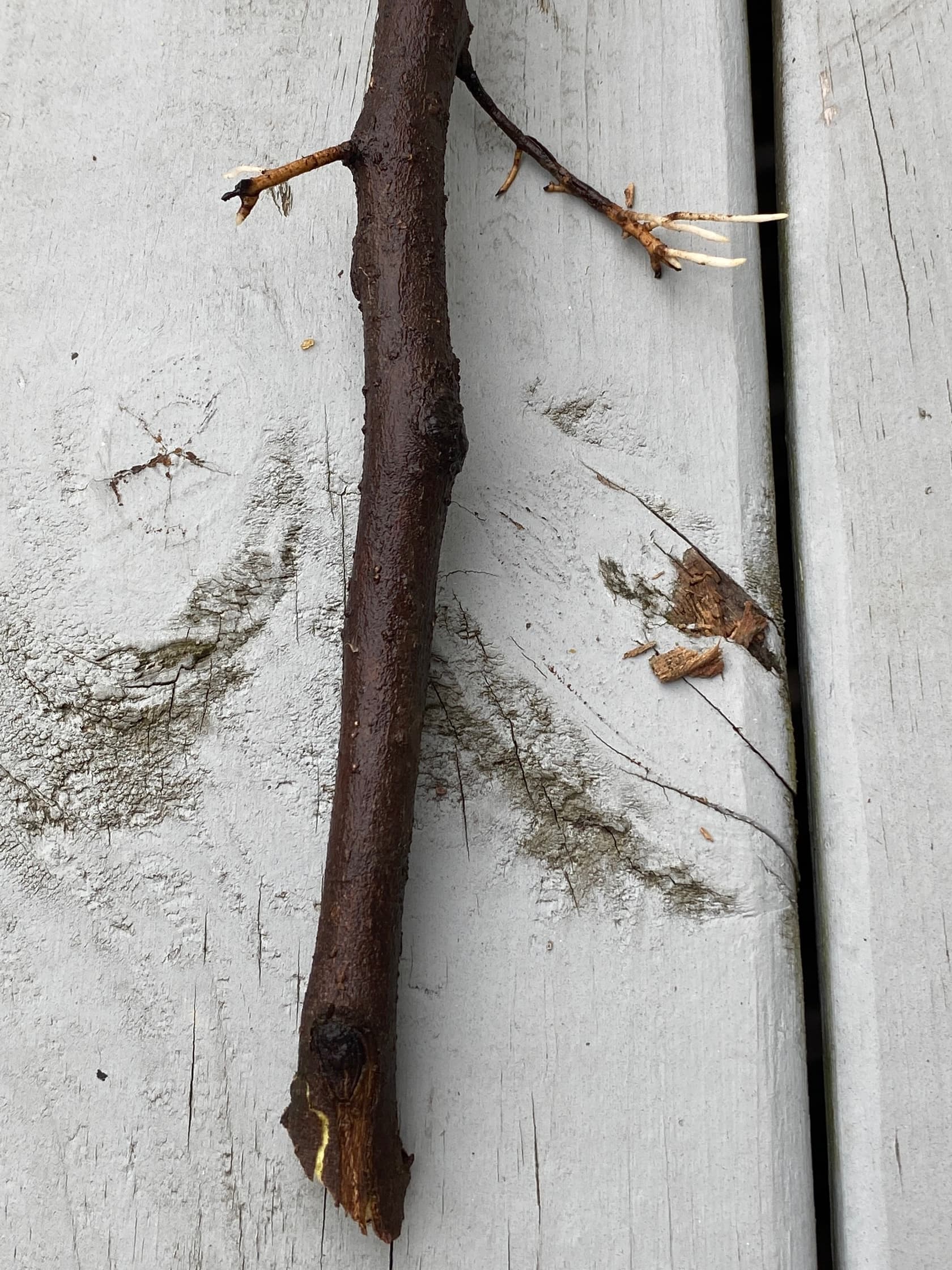This was my first attempt to root a goumi limb. All I did was lightly snip off the leaves and put into a clear container of soil just like I do with muscadines. I definitely won’t do this method again. @TNHunter had what I think is one of the best methods. I didn’t see any roots through the clear container and I decided to remove it which had been on over a year. As you can see there are a small amount of roots so I cut it back and potted. I placed it in a mostly shady area and it might survive.